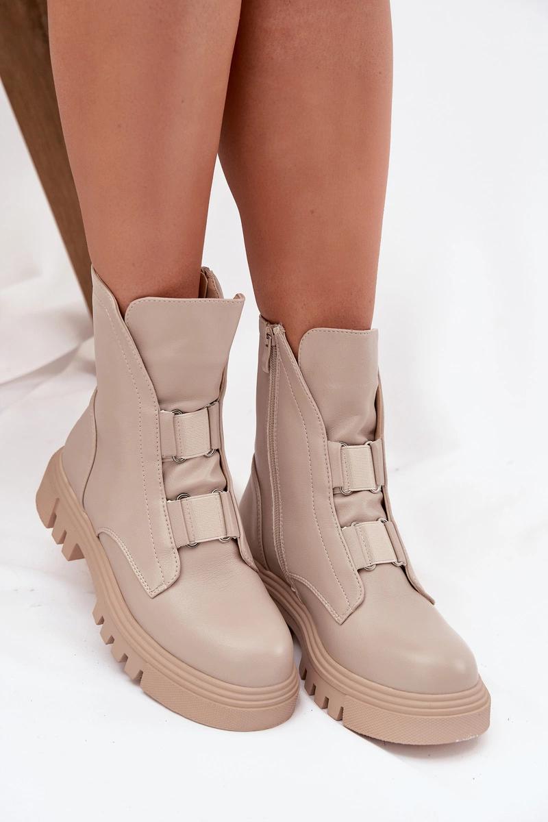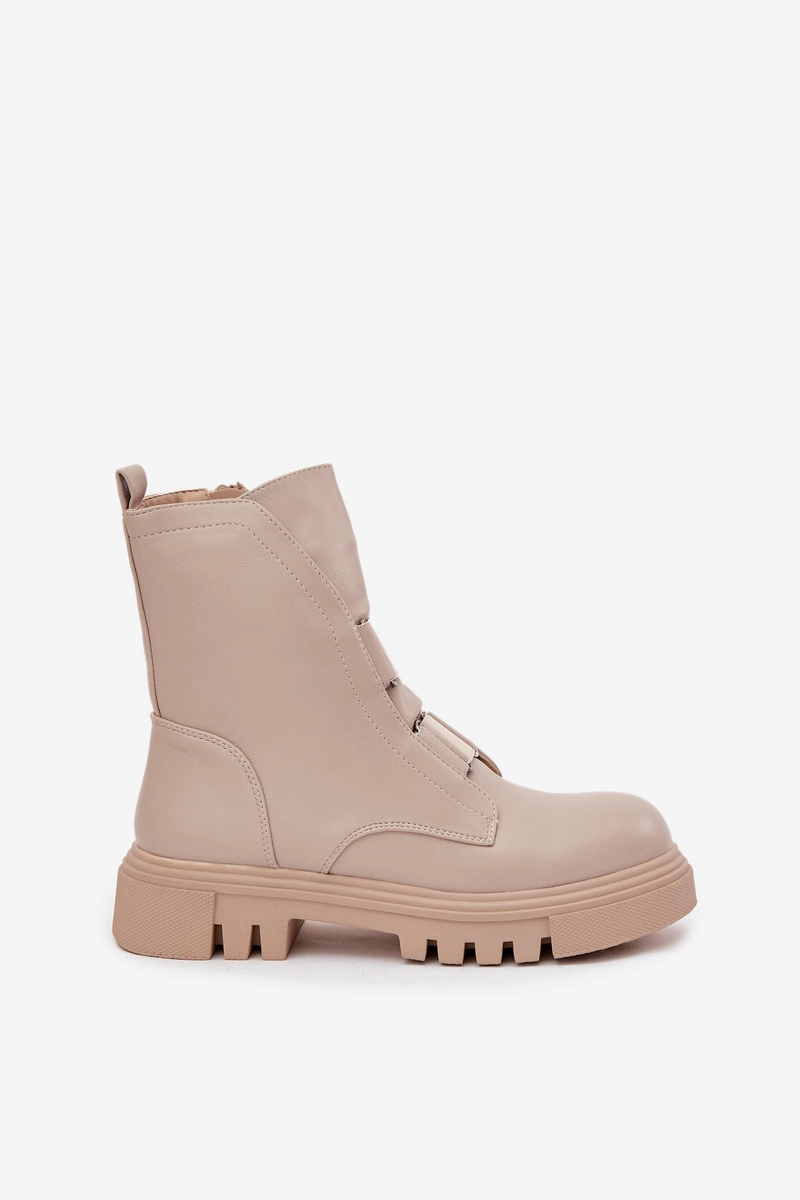 Ocieplane Botki Workery Damskie Na Zamek Eko Skórzane Jasnobeżowe Mailyra