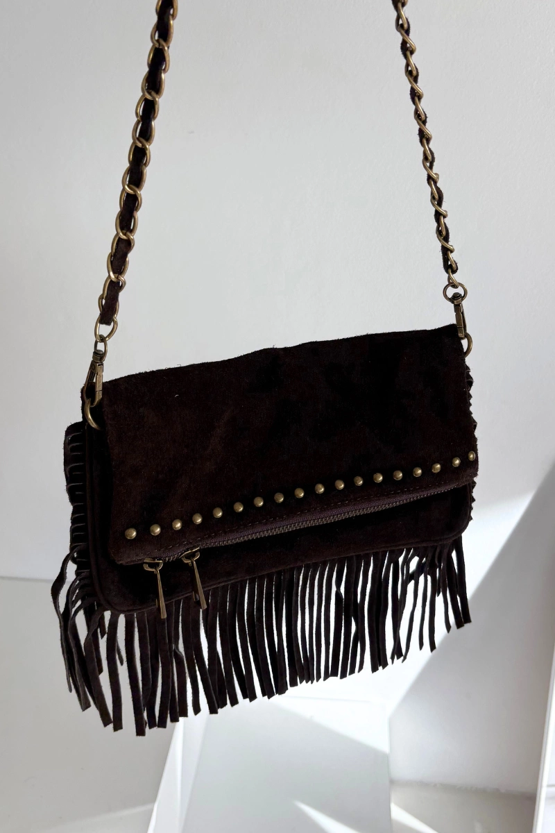Zamszowa Torebka Z Frędzlami Na Łańcuszku Czekoladowa Narella