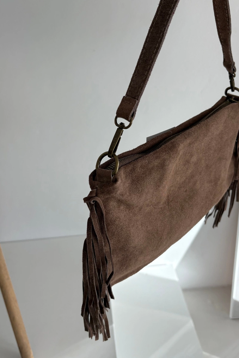 Skórzana Zamszowa Torebka Z Frędzlami Brązowa Jessira