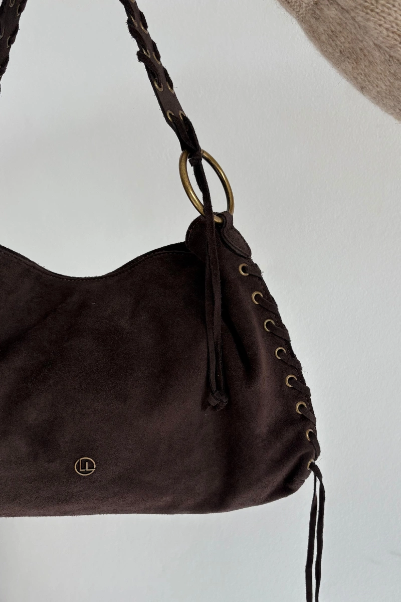 Skórzana Zamszowa Torebka Z Ozdobnym Sznurowaniem Czekoladowa Janelis
