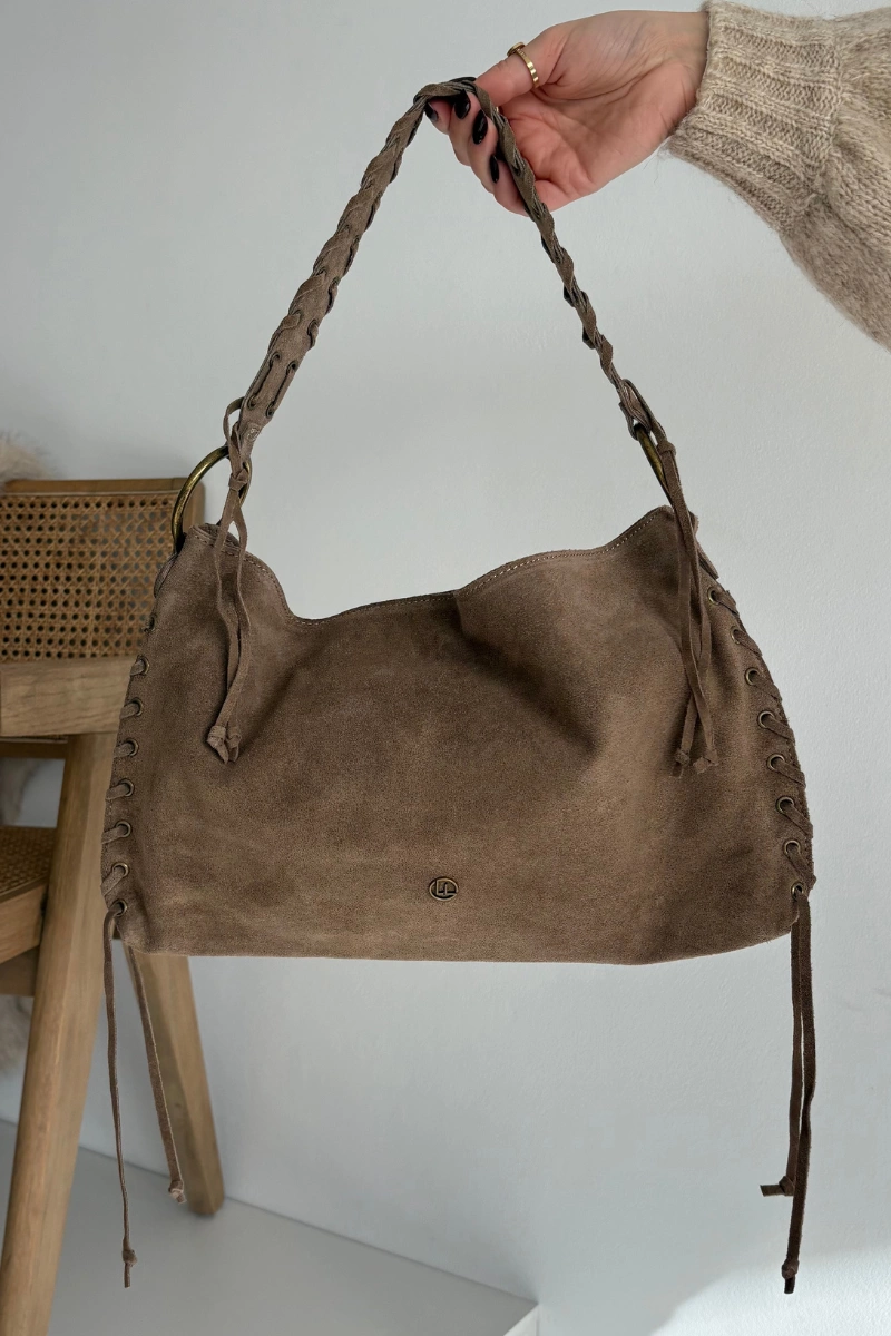 Skórzana Zamszowa Torebka Z Ozdobnym Sznurowaniem Ciemnobeżowa Janelis