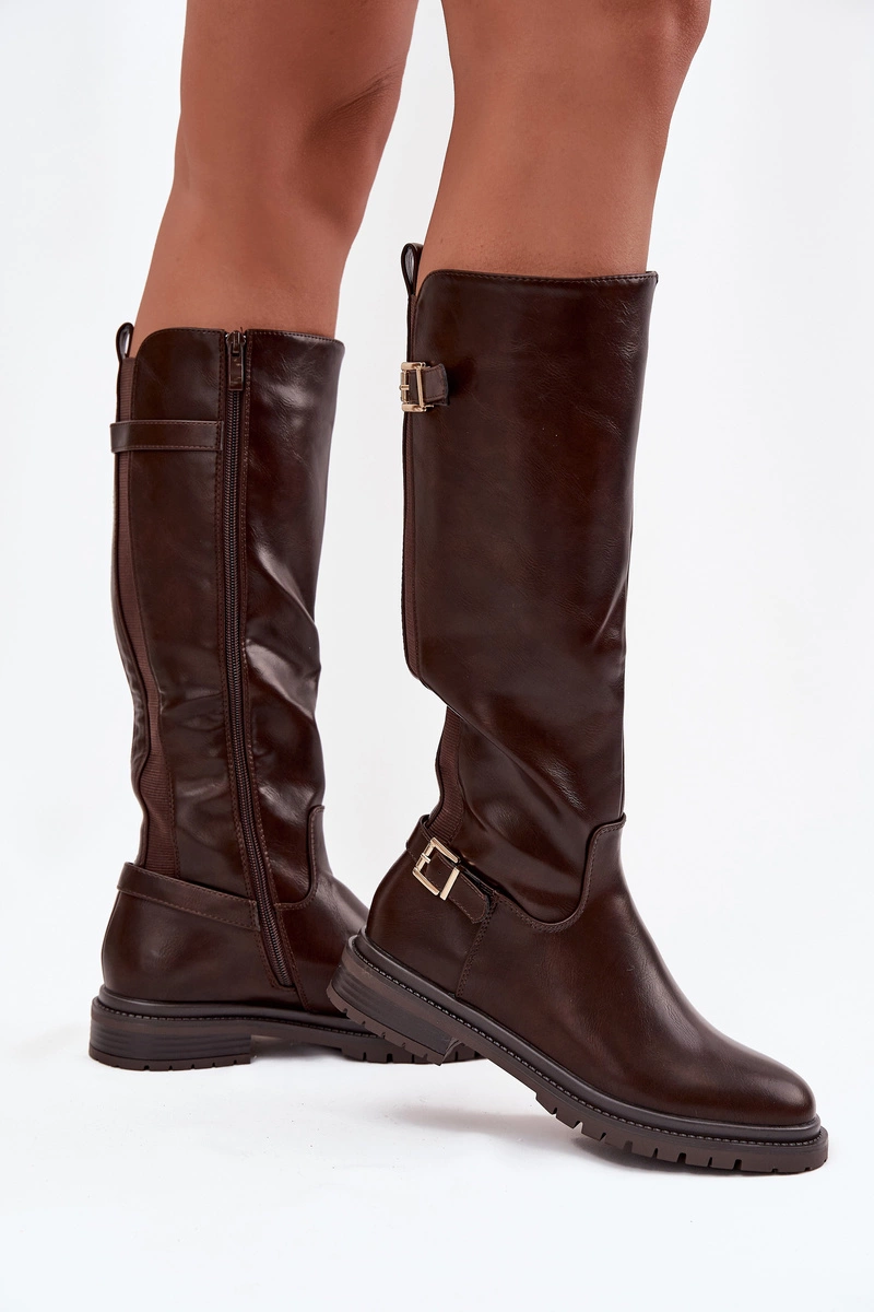 Ocieplane Kozaki Damskie Na Płaskim Obcasie Z Klamrami Czekoladowe Sorelle