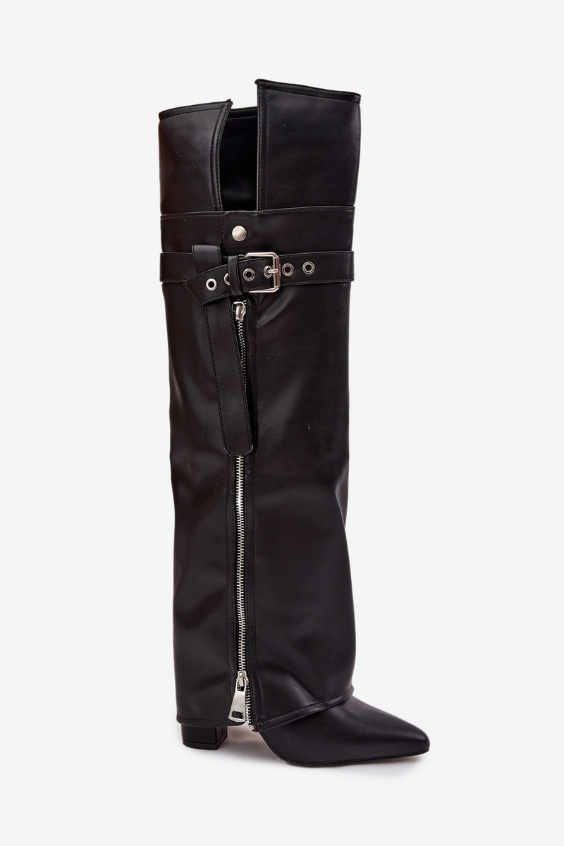 Ocieplane Kozaki Damskie Za Kolano Na Słupku Z Paskiem Klamrą I Srebrnym Zamkiem Czarne Reisa