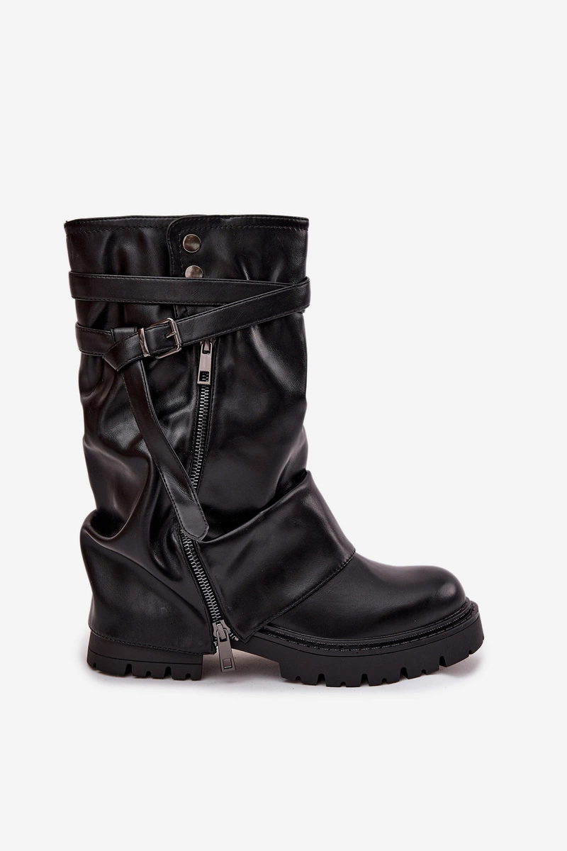 Kozaki Damskie Z Wywiniętą Cholewką Do Połowy Łydki Z Paskiem Czarne Darisa