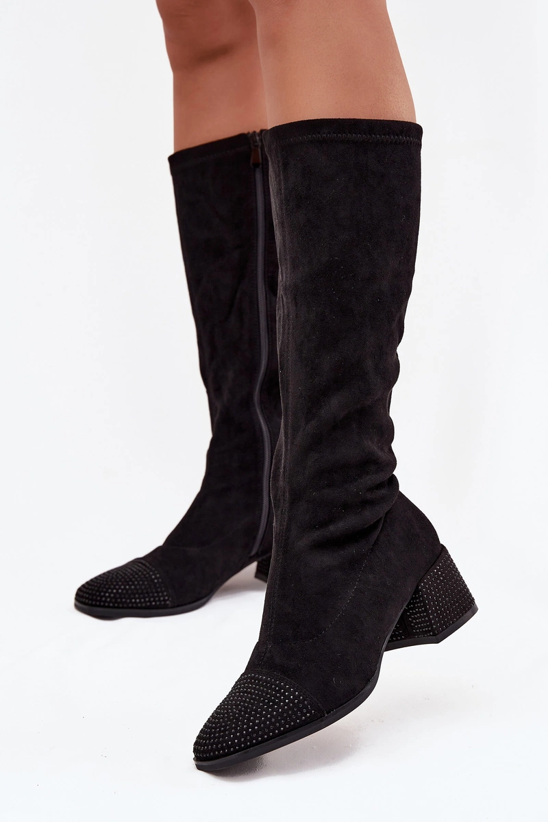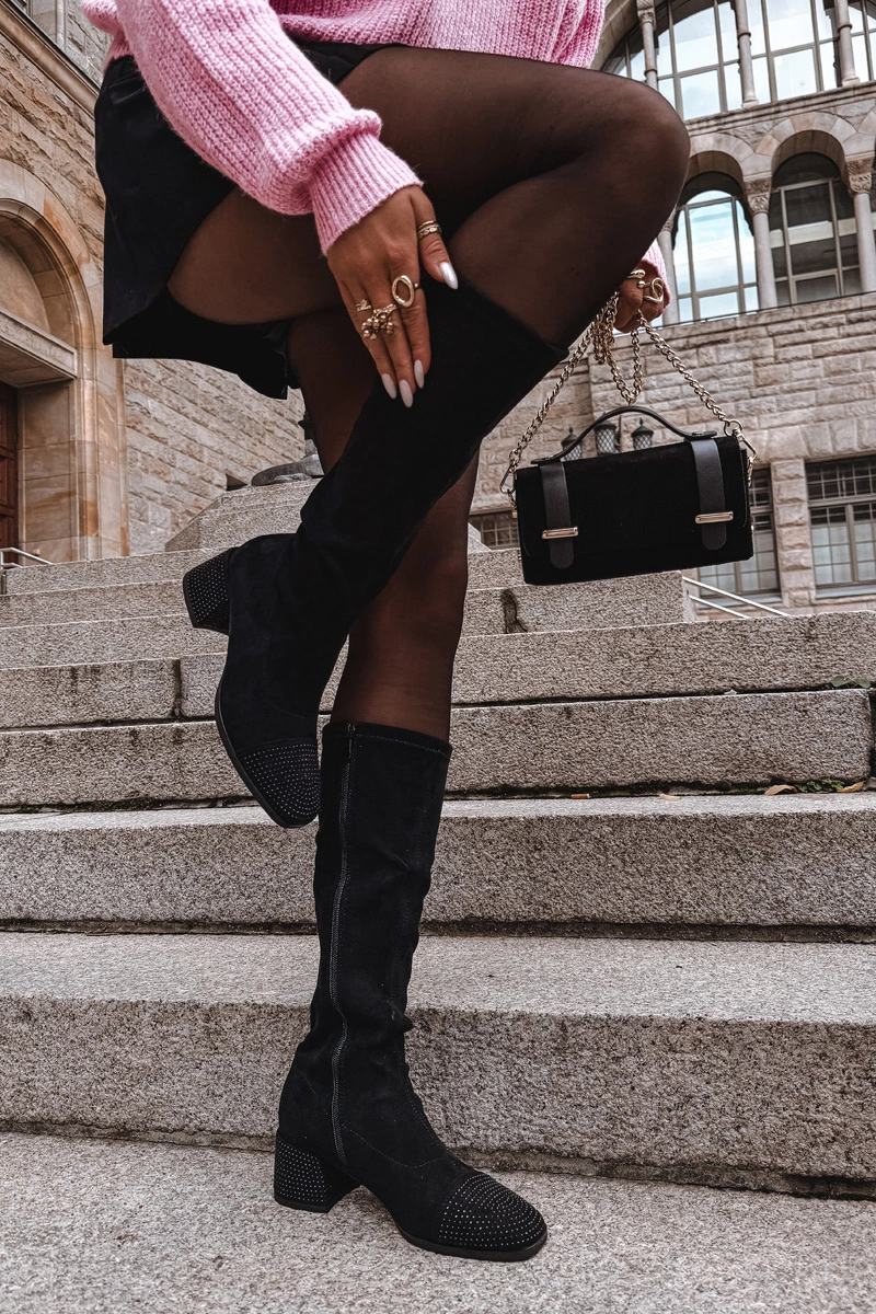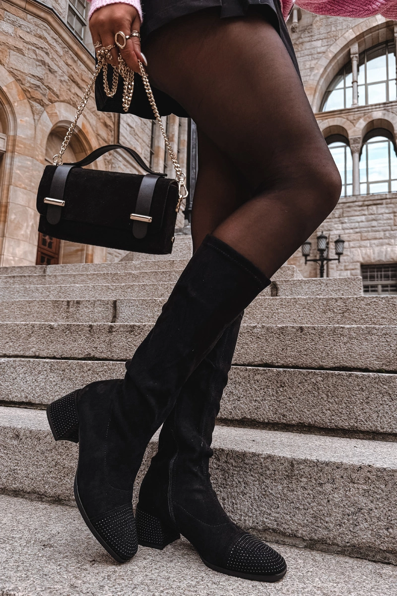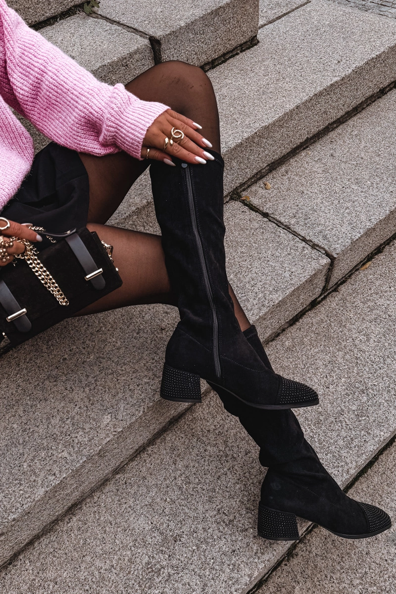 Kozaki Damskie Ze Zdobieniem Na Klocku Eko Zamszowe Czarne Ivanna