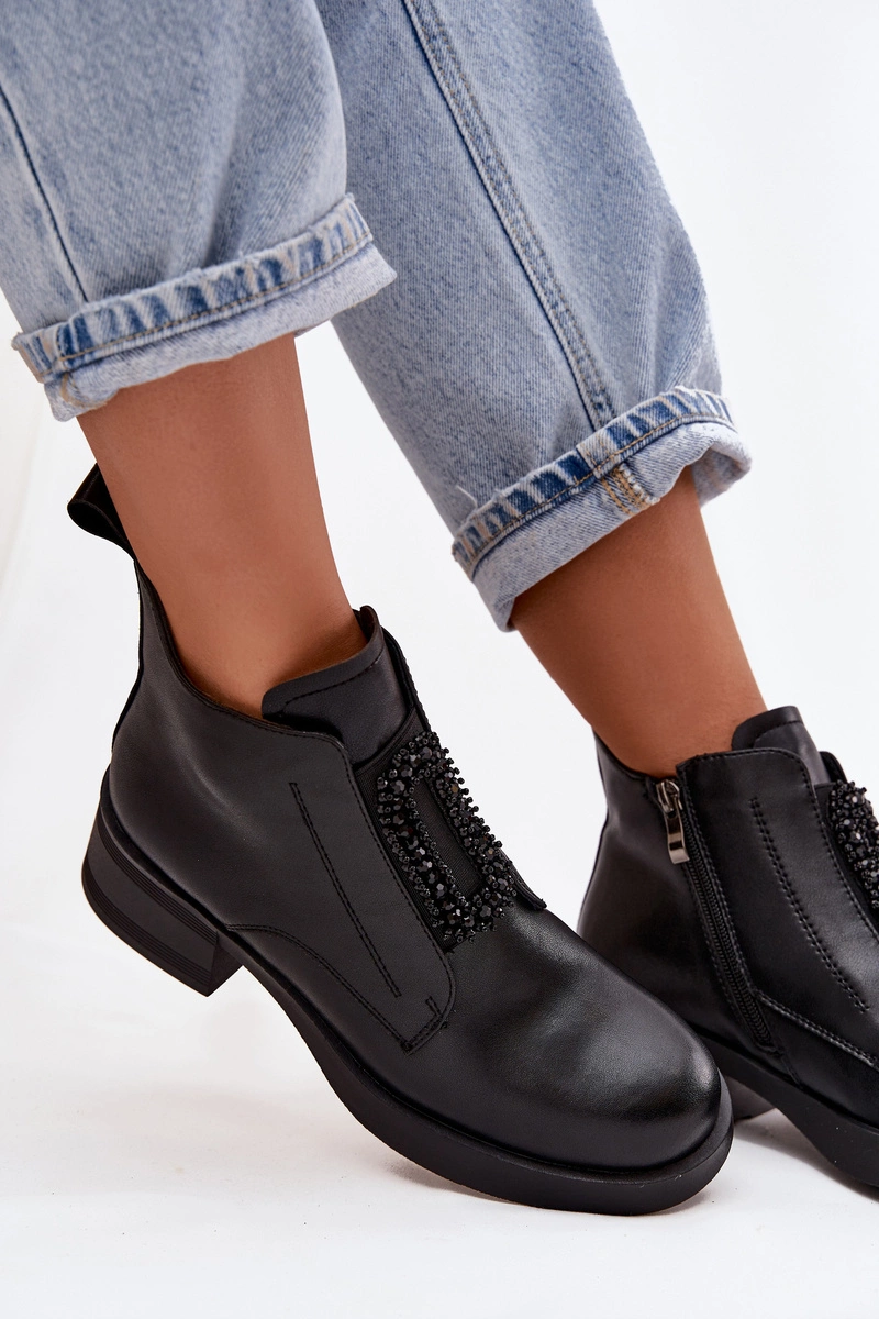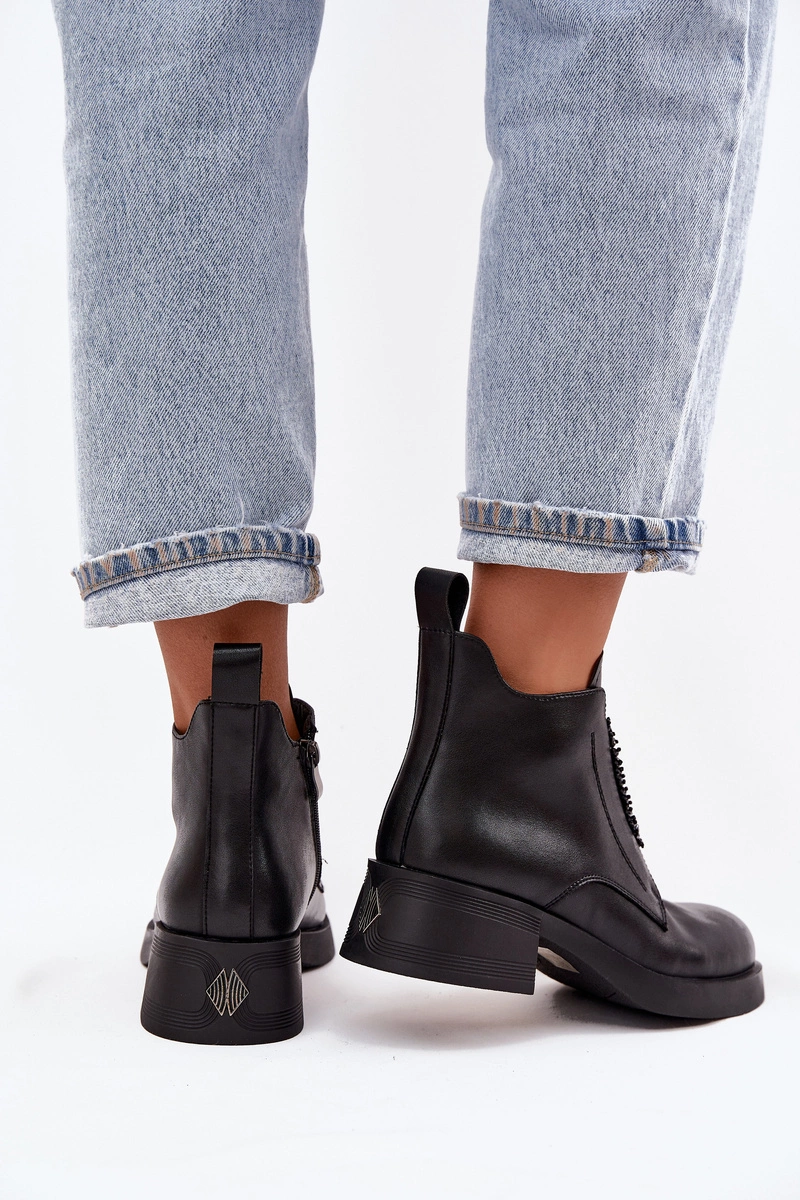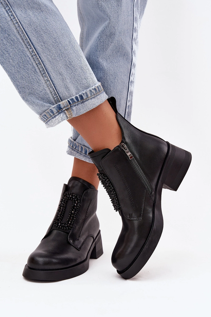 Skórzane Botki Damskie Na Klocku Z Ozdobą D&A JC52-869 Czarne