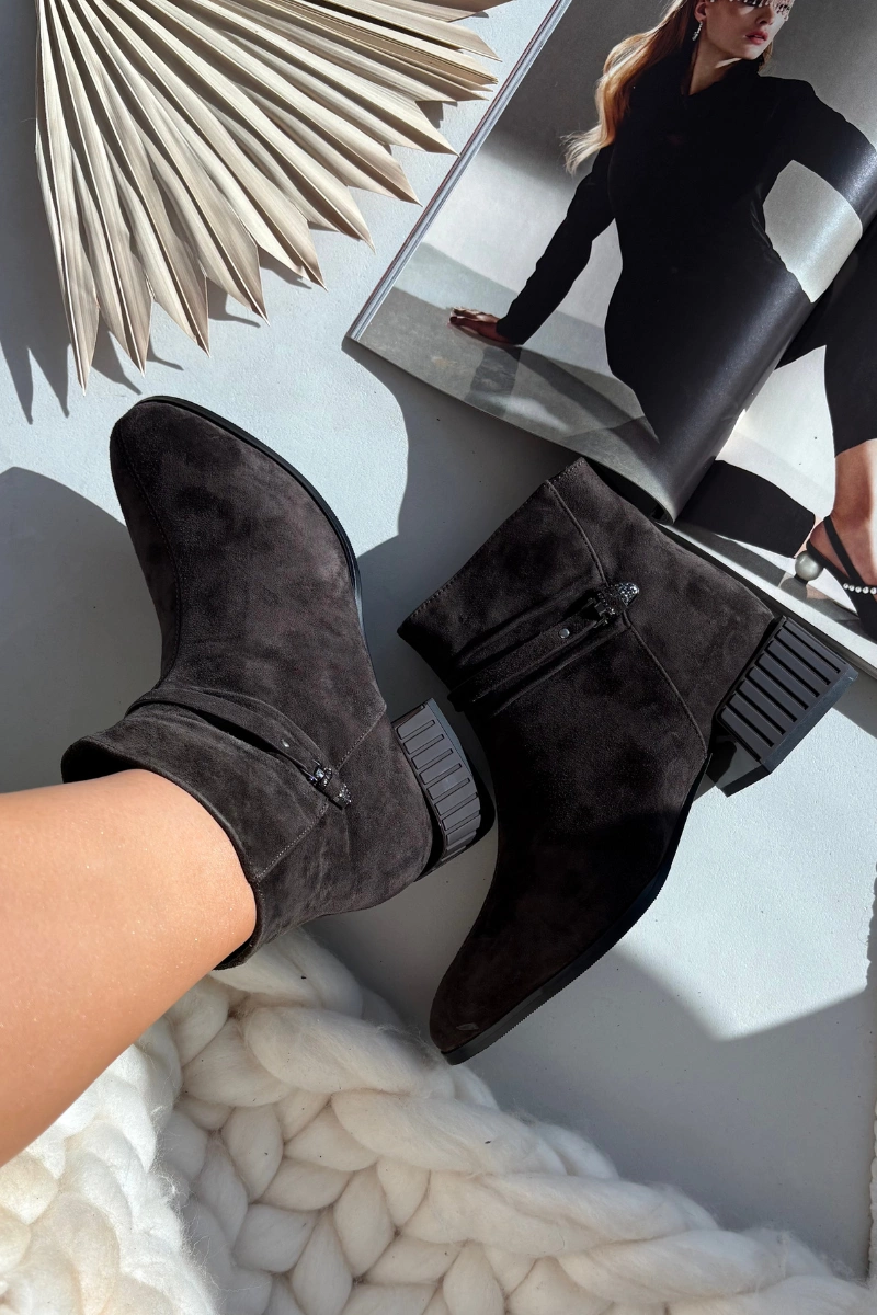 Botki Damskie Z Naturalnego Zamszu Na Klocku Ocieplane D&A CR52-651 Czekoladowe