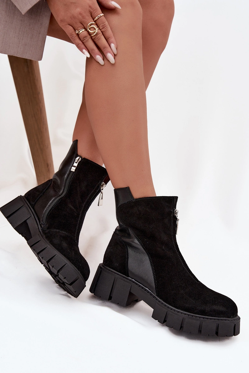 Stylowe botki damskie z naturalnego zamszu to propozycja dla kobiet ceniących elegancję w nowoczesnym wydaniu. Model osadzony na masywnym obcasie typu klocek gwarantuje stabilność i wygodę, a ocieplane wnętrze sprawia, że buty są idealne na chłodniejsze dni. Zamek z boku ułatwia zakładanie, natomiast ozdobny zamek z przodu dodaje całości modnego, nieco rockowego charakteru. Zaokrąglone noski podkreślają klasyczny fason. To uniwersalne botki, które świetnie sprawdzą się w codziennych stylizacjach, a także w bardziej eleganckich zestawach. Przy wyborze rozmiaru prosimy sugerować się tabelą rozmiarów.