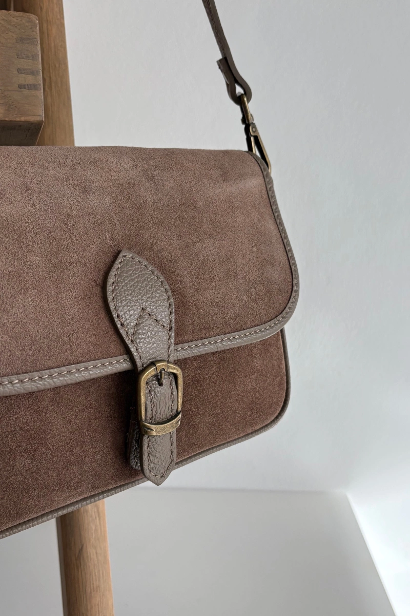 Skórzana Zamszowa Torebka Listonoszka Ciemnobeżowa Norla