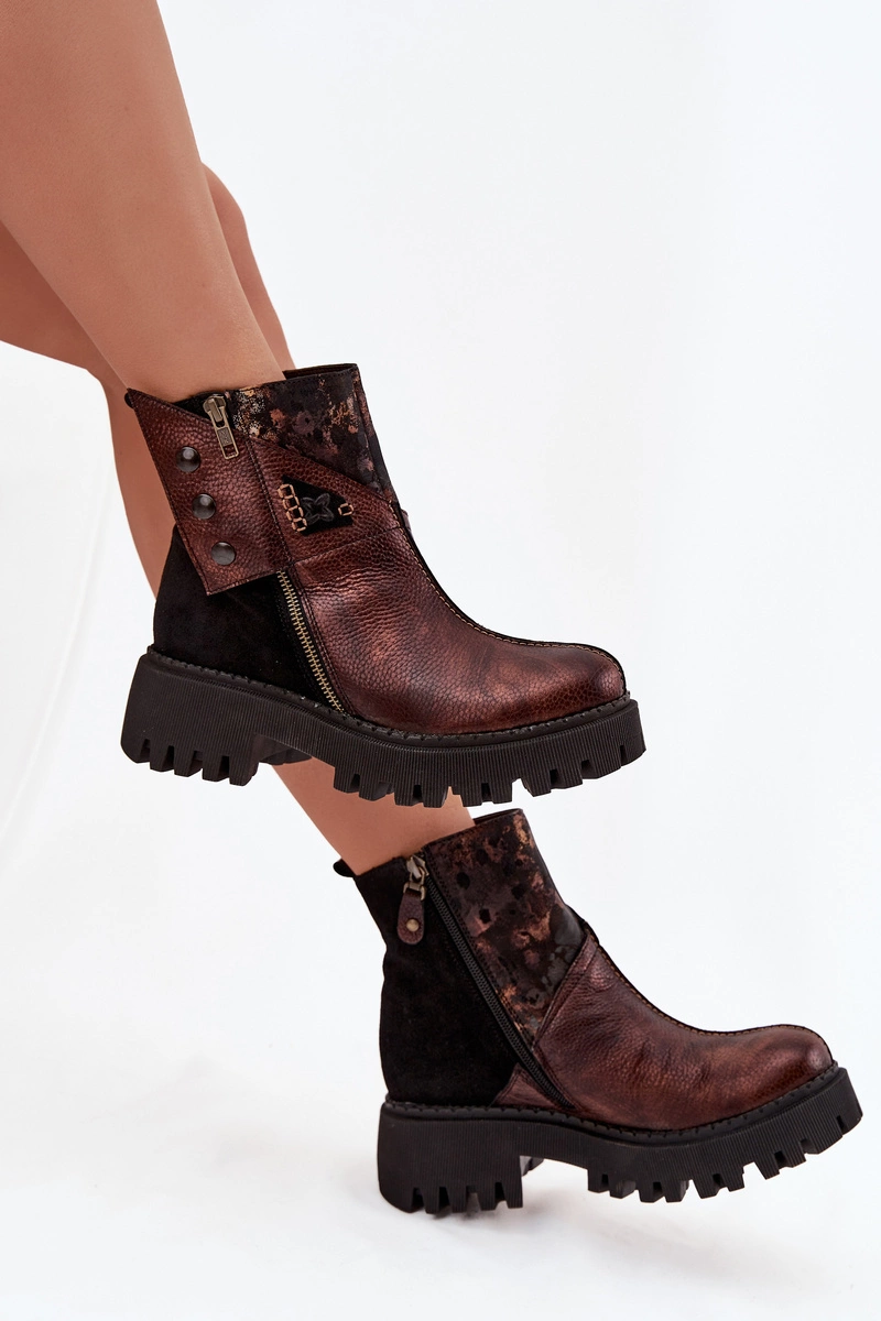 Skórzane Ocieplane Botki Na Platformie I Płaskim Obcasie Maciejka 06140-02 Brązowe