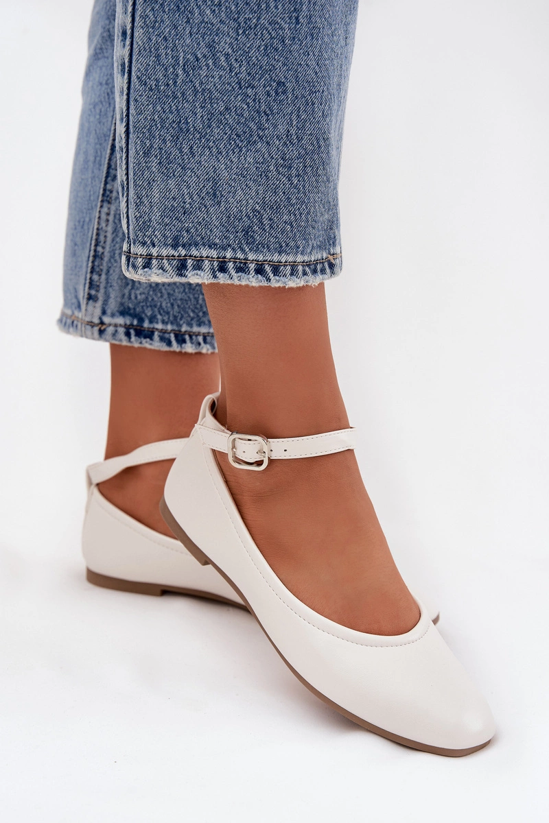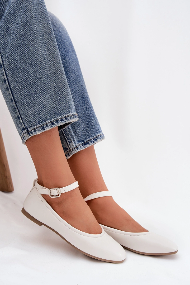 Baleriny Damskie Z Paskiem I Klamrą Białe Janelor