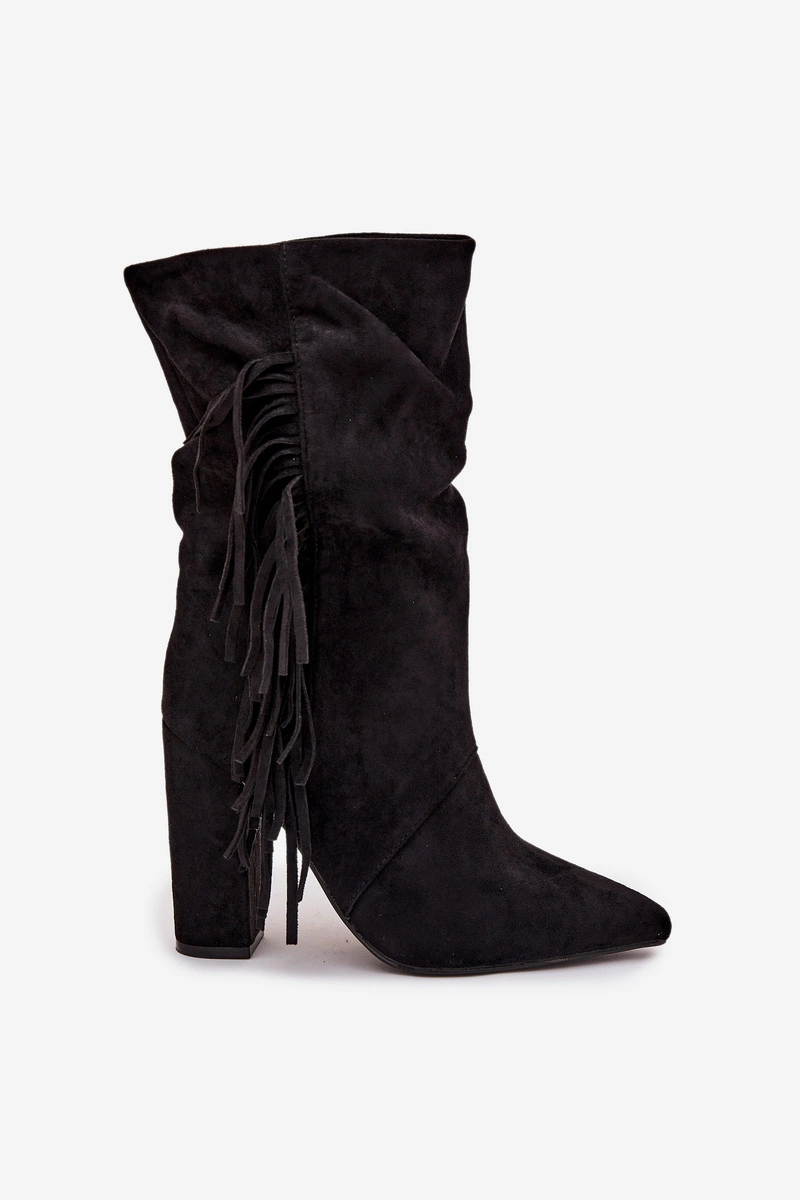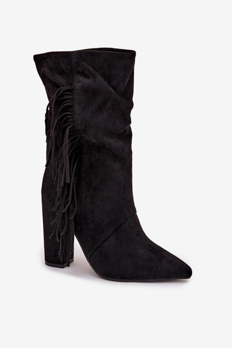 Botki Damskie Na Słupku Z Frędzlami I Marszczeniem Ocieplane Czarne Darlina