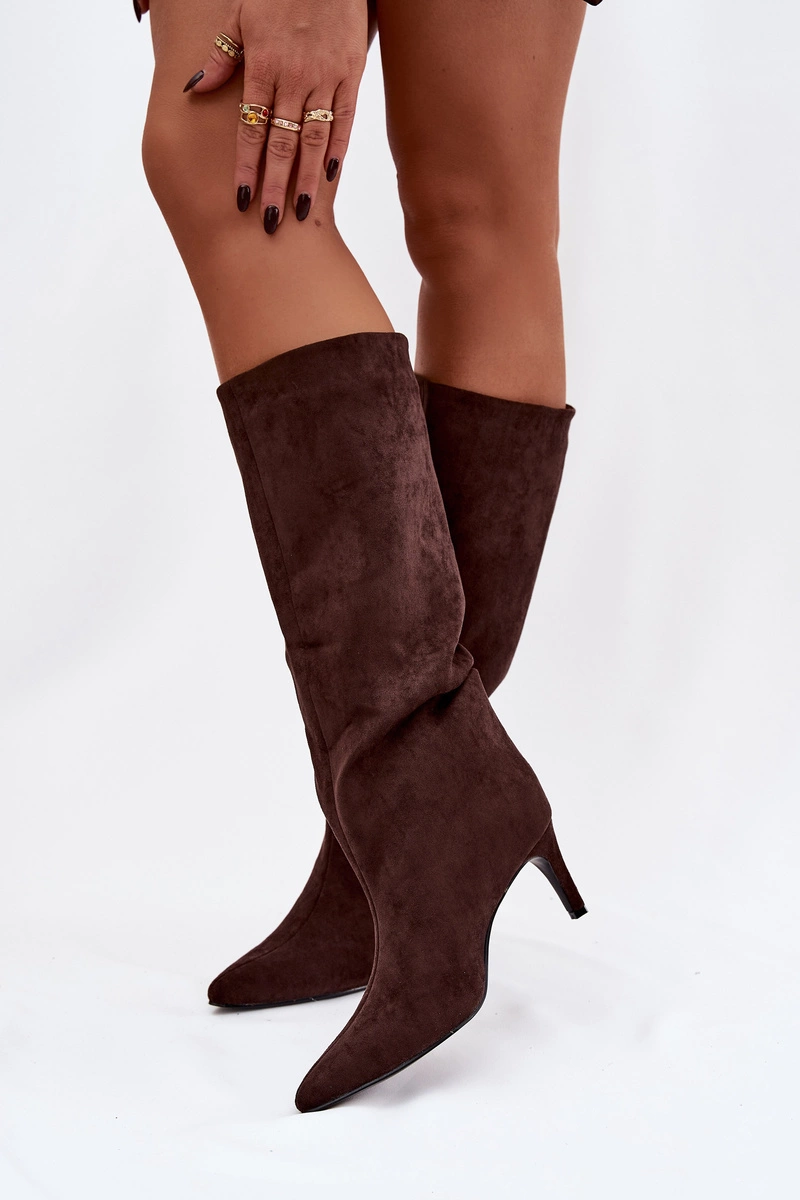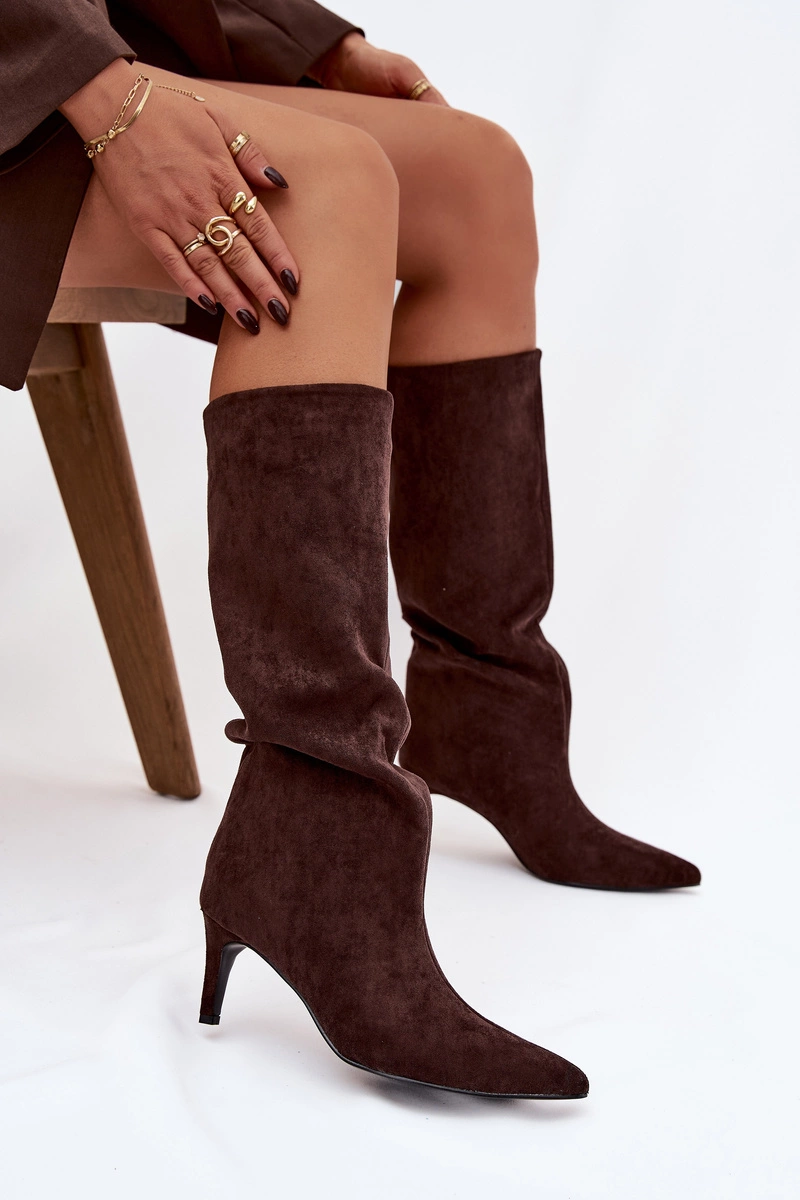 Kozaki Damskie Wsuwane Ocieplane Na Szpilce Czekoladowe Olivienne