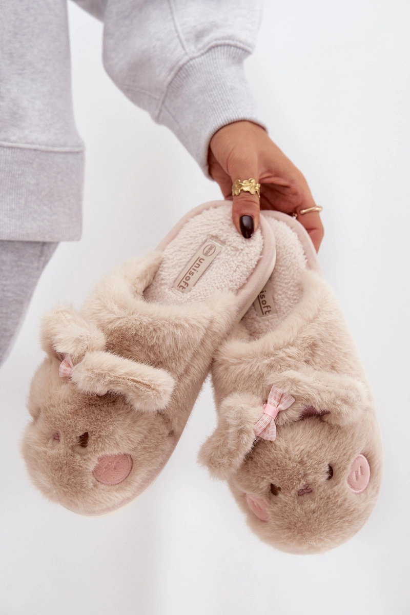 Futrzane Kapcie Damskie Z Uszkami I Kokardką Beżowe Corayne