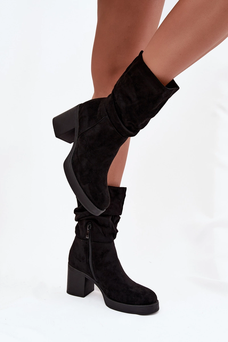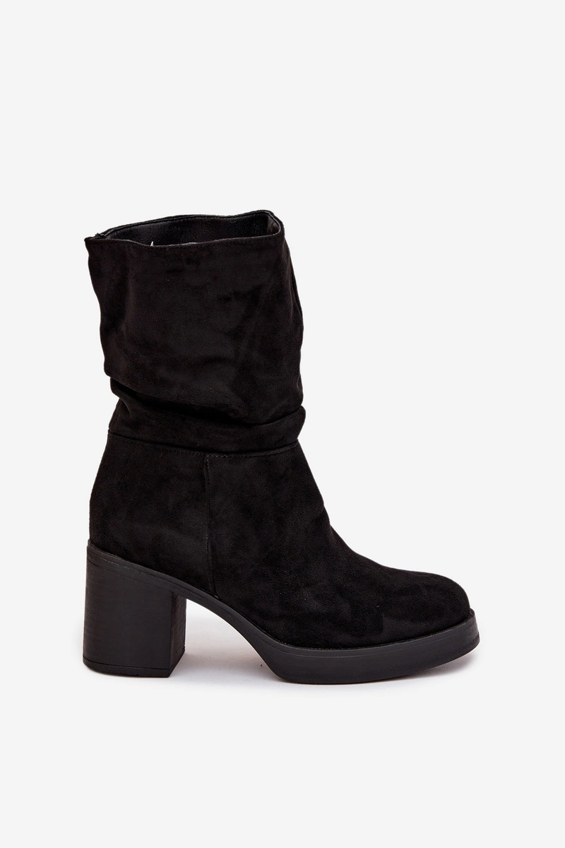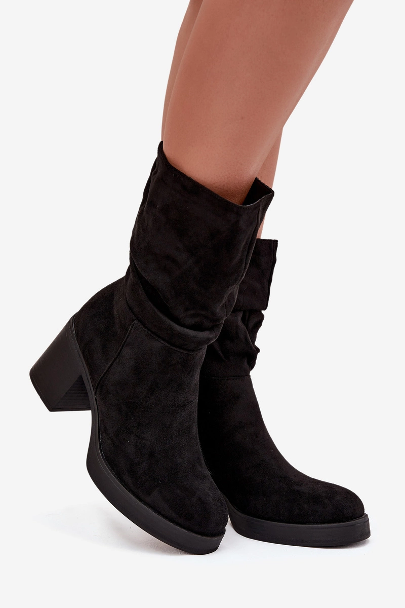 Botki damskie wykonane z eko zamszu. Model wyróżnia się marszczoną cholewką, która nadaje modnego charakteru. Wsuwany fason z dodatkowym suwakiem zapewnia wygodę zakładania. Buty osadzone są na stabilnym obcasie typu słupek, co gwarantuje komfort podczas chodzenia oraz subtelnie wysmukla sylwetkę. Wnętrze ocieplone pianką pokrytą tkaniną zapewnia ciepło w chłodniejsze dni. To doskonały wybór na sezon jesienno-zimowy – uniwersalne botki, które sprawdzą się zarówno w codziennych, jak i bardziej eleganckich stylizacjach.  Przy wyborze rozmiaru prosimy sugerować się tabelą rozmiarów.