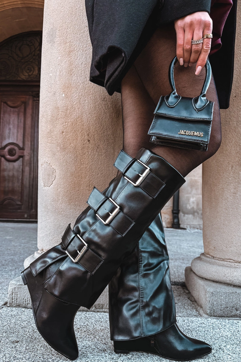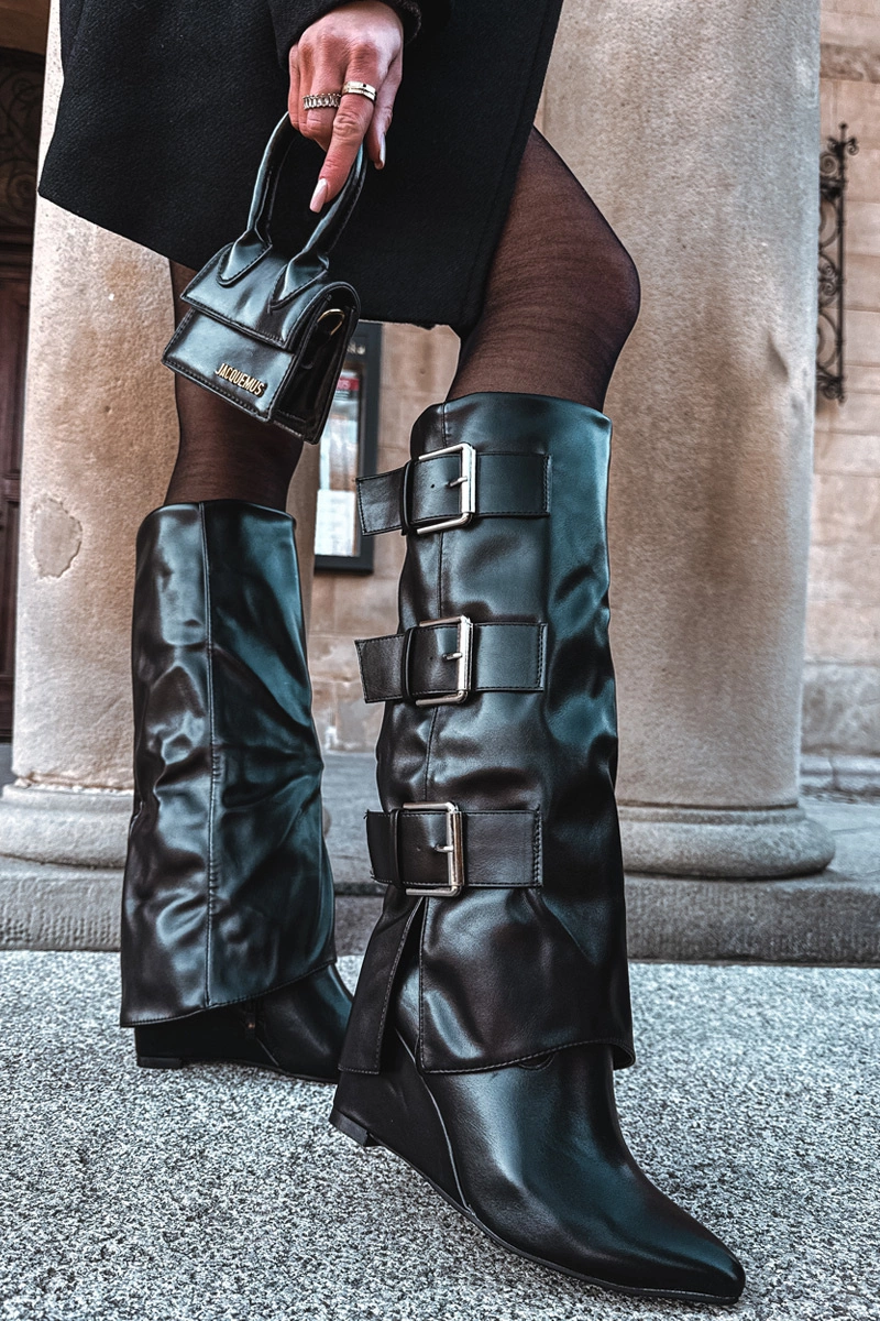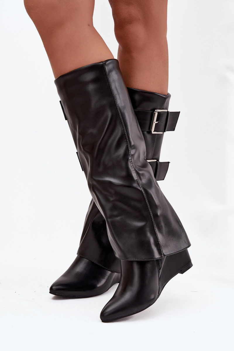 Kozaki Damskie Na Koturnie Z Wywiniętą Cholewką I Srebrnymi Klamrami Czarne Sarisse