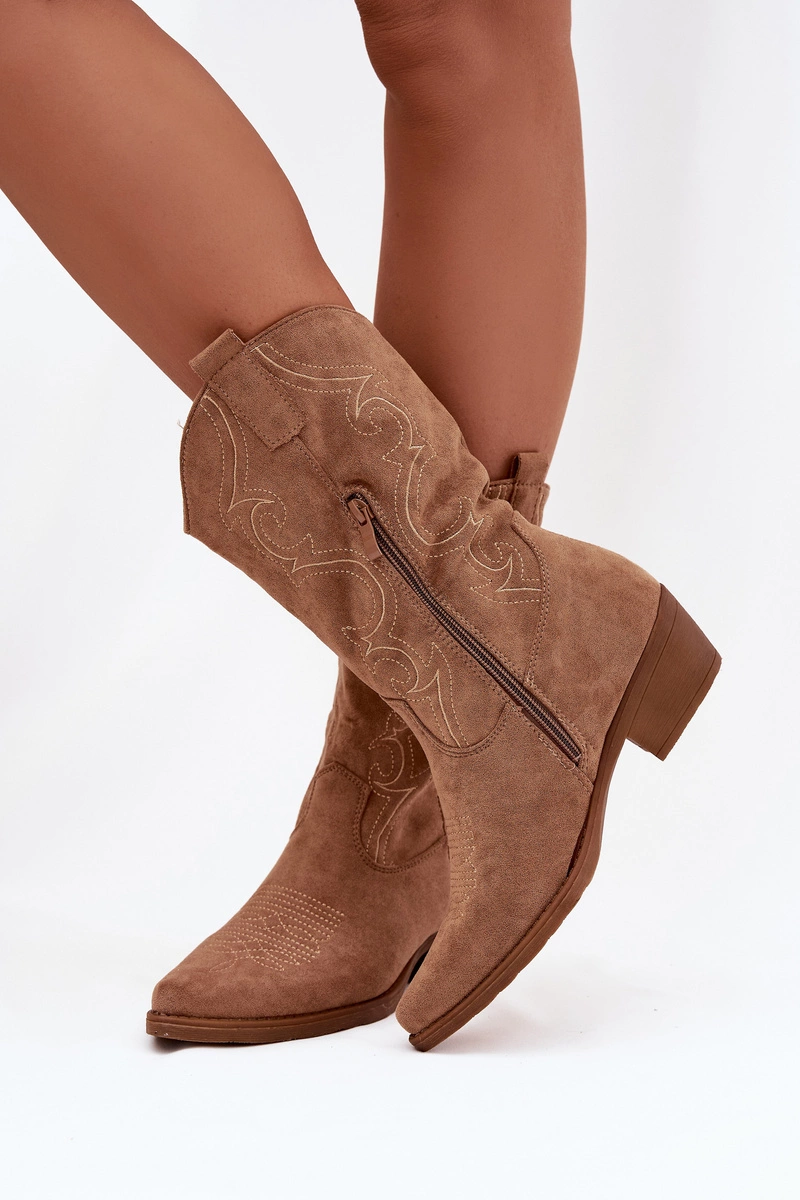 Botki kowbojki damskie wykonane z miękkiego eko zamszu to idealne połączenie stylu i wygody. Model osadzony na niskim, ściętym obcasie nawiązuje do klasycznego, westernowego stylu, a noski w szpic dodają całości kobiecego charakteru. Buty są ocieplane kocem obuwniczym, dzięki czemu zapewniają ciepło i komfort w chłodniejsze dni. Wsuwane z bocznym zamkiem – gwarantują wygodę zakładania. Przeszycia na cholewce podkreślają ich wyjątkowy styl. To idealny model do casualowych i jesienno-zimowych stylizacji, świetnie komponujący się z jeansami, sukienkami czy spódnicami w stylu boho.