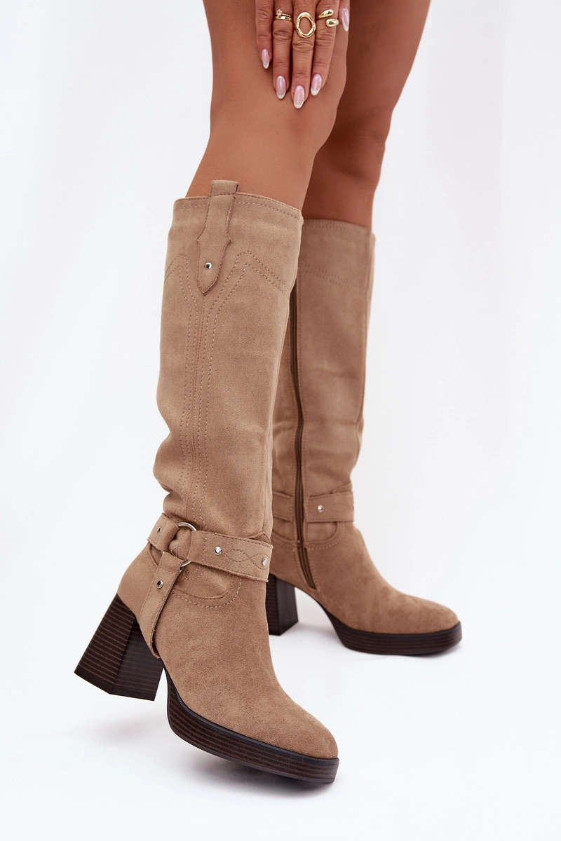 Ocieplane Kozaki Damskie Na Słupku Z Przeszyciami Beżowe Alessara