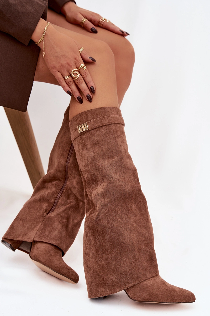 Kozaki Eko Zamszowe Obcas Słupek Na Zamek Ocieplane Wywinięta Cholewka Ciemnobeżowe Evyra