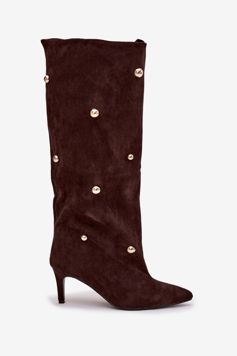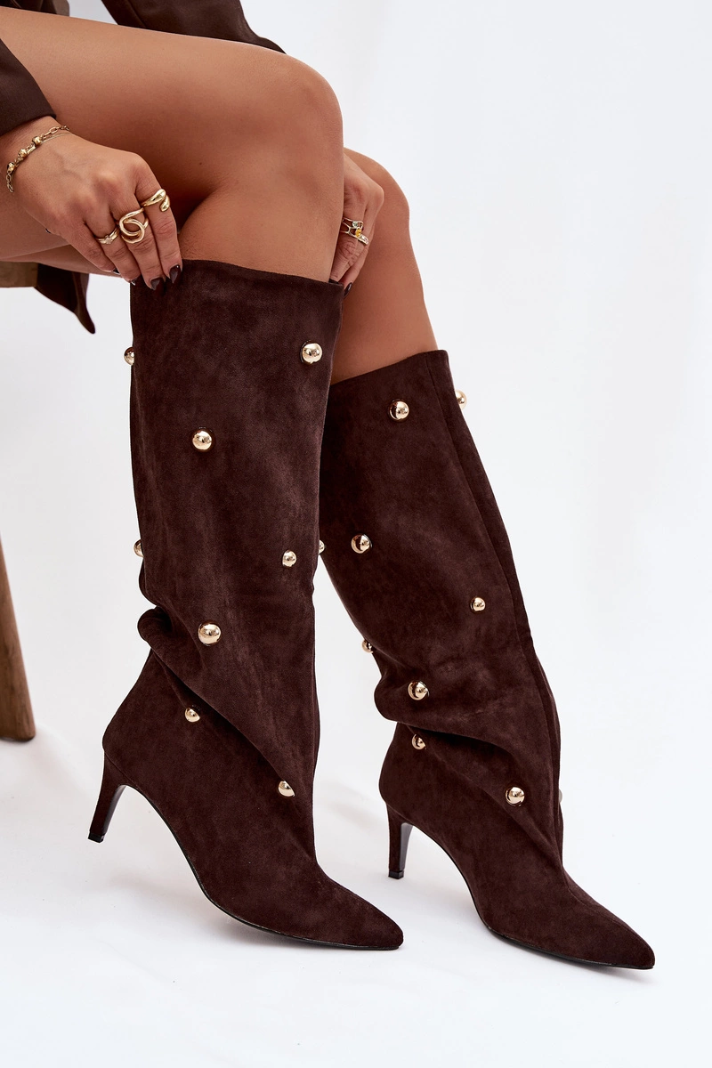Wsuwane Kozaki Damskie Na Szpilce Ze Złotymi Ozdobami Czekoladowe Thaliane