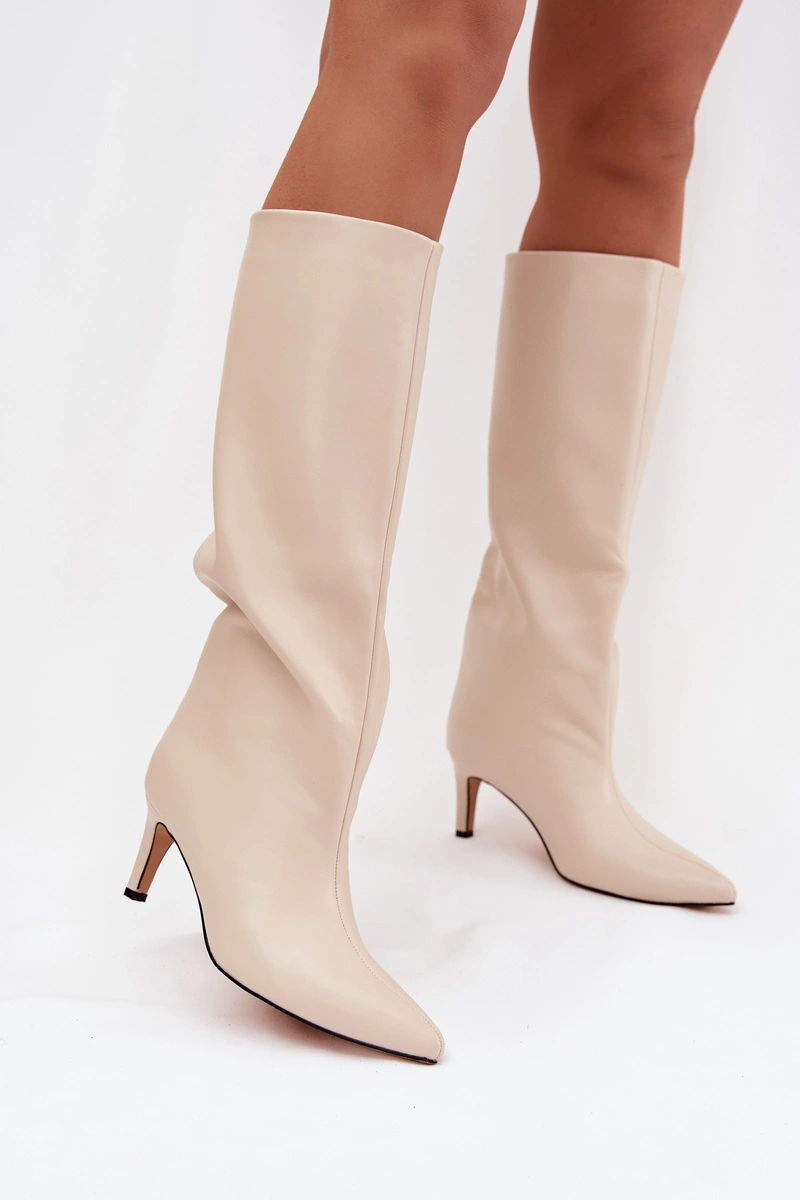 Kozaki Damskie Wsuwane Ocieplane Na Szpilce Jasnobeżowe Olivienne