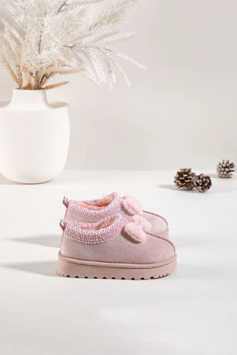 Śniegowce dziecięce wykonane z miękkiego eko zamszu to idealny wybór na zimowe dni. Model został ozdobiony haftem i uroczą kokardką, co nadają dziewczęcego uroku. Wnętrze butów wyścielone jest ciepłym futerkiem, zapewniającym komfort i ochronę przed chłodem. Podeszwa z gumowego tworzywa gwarantuje dobrą przyczepność i stabilność na śliskich nawierzchniach. Idealne do codziennych, zimowych zabaw i spacerów.