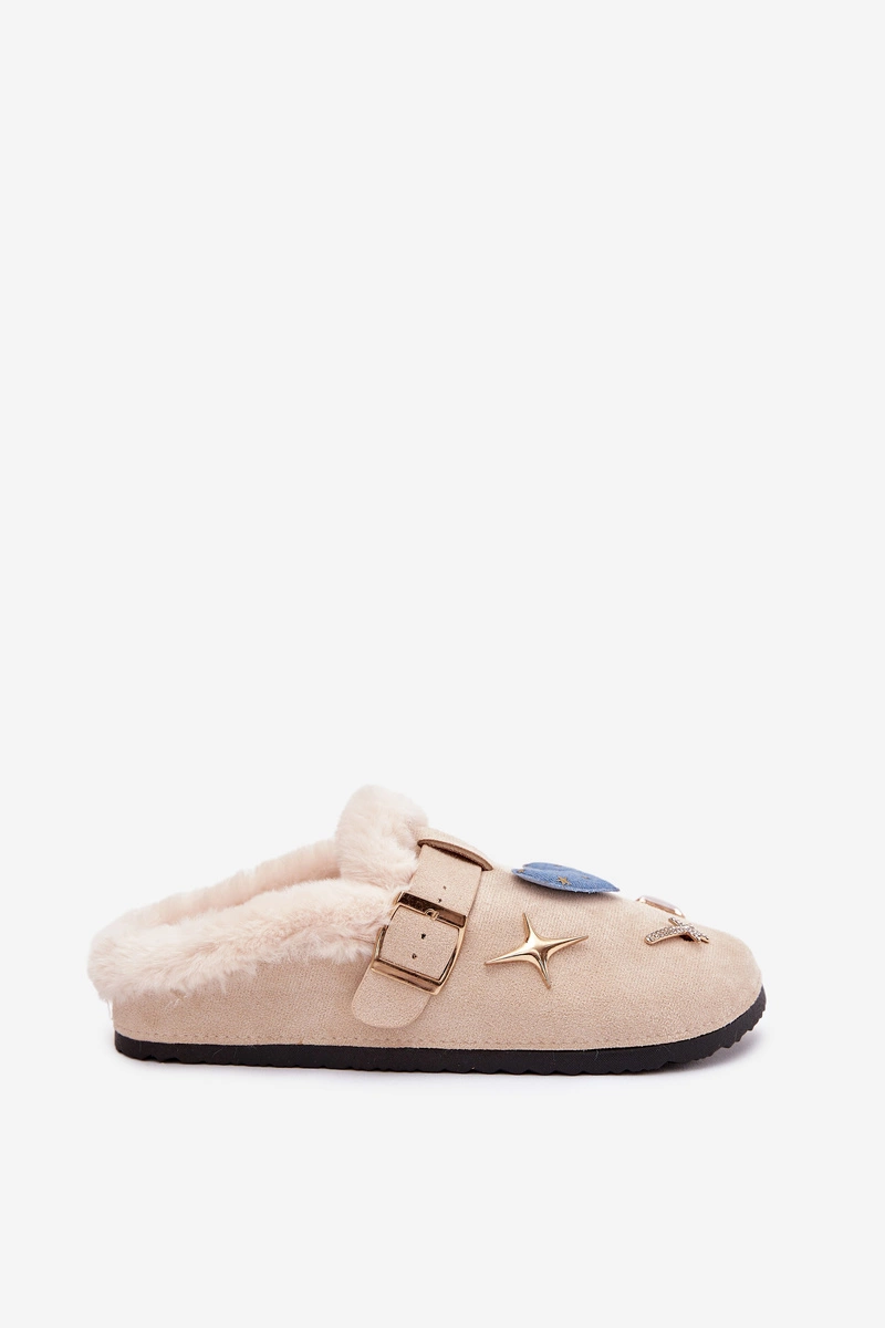 Kapcie Damskie Z Ozdobami I Klamrą Ocieplane Futerkiem Beżowe Thalora