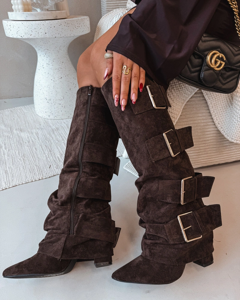 Kozaki Damskie Na Słupku Z Wywiniętą Cholewką I Złotymi Klamrami Eko Zamszowe Czekoladowe Isavelle