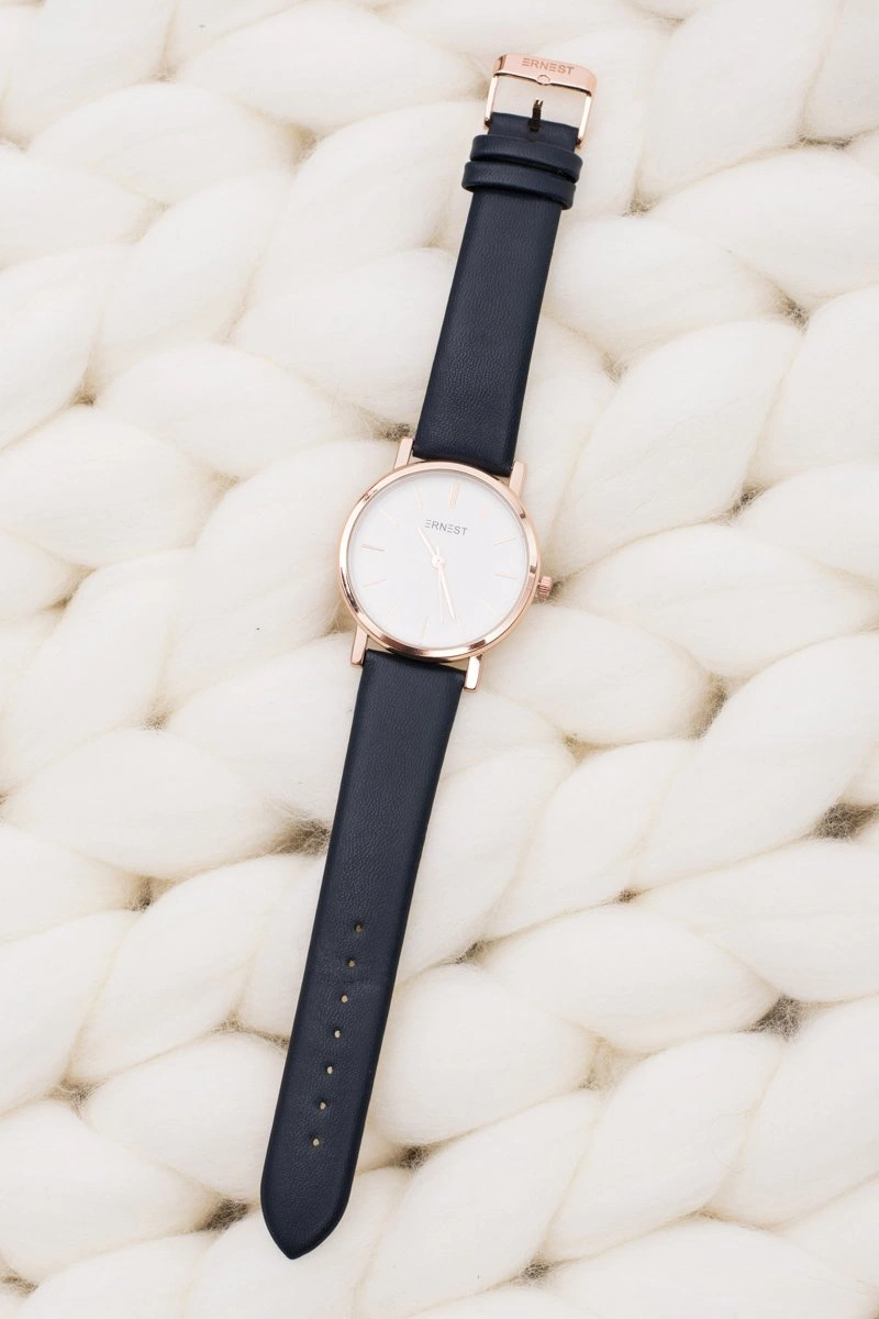 Elegancki Skórzany Granatowy Damski Zegarek Ernest
