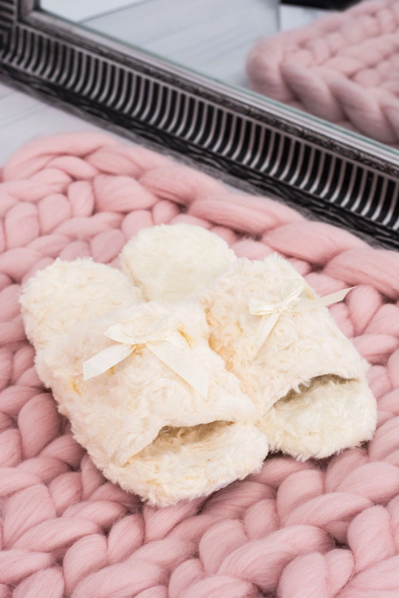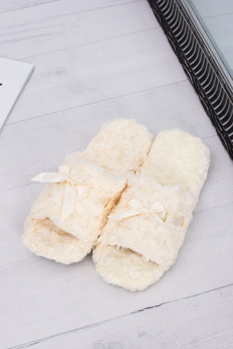 Damskie Klapki Domowe Beżowe Papcie ze Wstążką