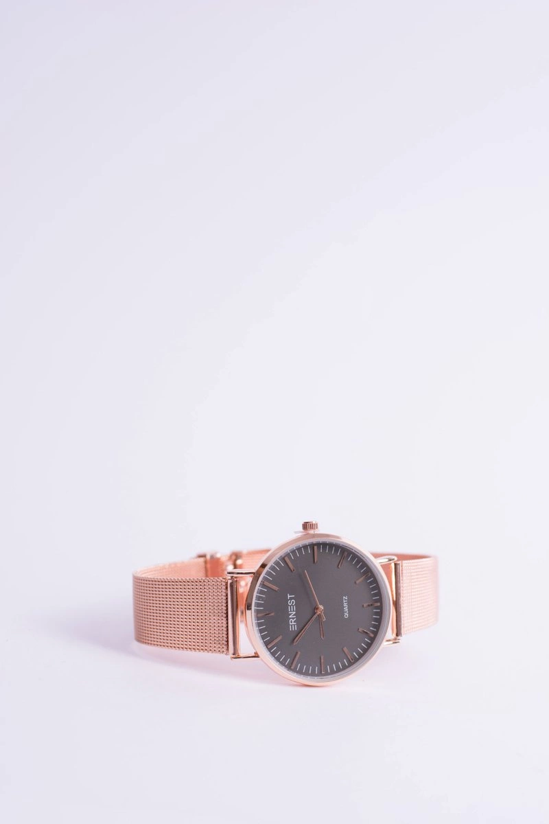 Zegarek Lena marki Ernest to gratka stworzona z myślą o kobietach kochających gustowne dodatki do swoich stylizacji. Zegarek posiada płaskie szkiełko oraz sekundnik. Bransoleta typu mesh w kolorze koperty, wykonana ze stali chirurgicznej z możliwością łatwej i szybkiej regulacji. Wysoka jakość wykonania mechanizmu oraz koperty.