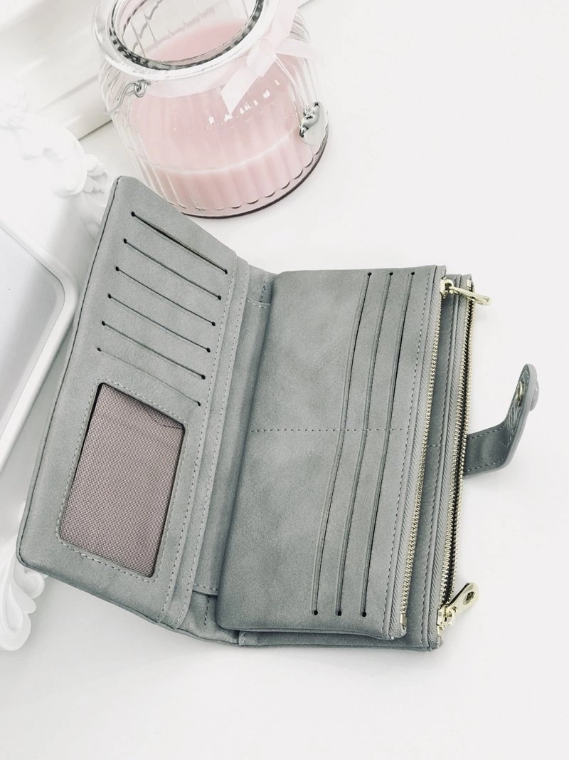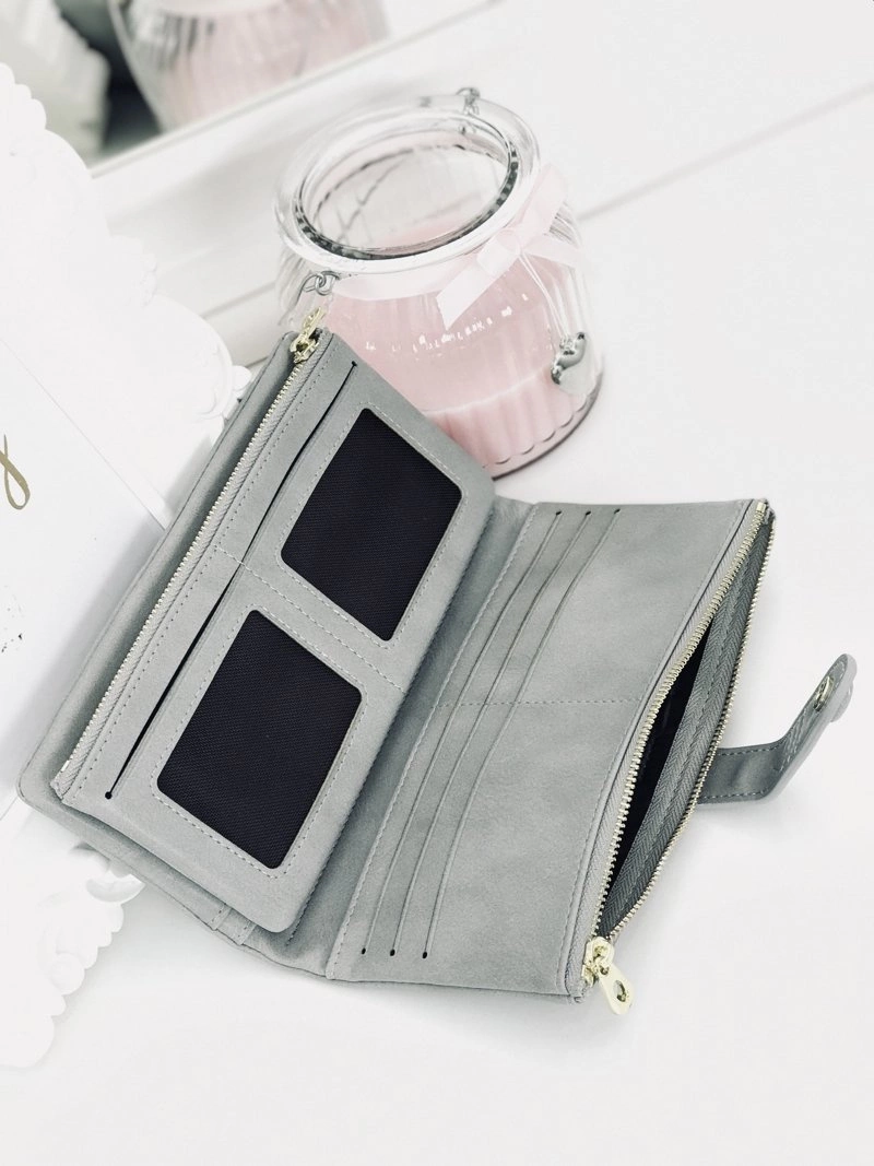 Przedstawiamy piękne portfele dla eleganckich Pań, dostępne w kilku cudownych kolorach. Produkty te charakteryzuje wyjątkowa prostota i elegancja. Wykonywane są przy użyciu najwyższej klasy materiałów. Staranne i piękne wykończenie każdego portfela oddaje niesamowitą dbałość o detale oraz modowy gust. Portfel posiada zapinanie na zatrzask. Wewnątrz znajdują się dwie kieszonki zapinane na zamek, 2 większe przegródki na różne drobiazgi, dokumenty, aż 12 przegródek na karty oraz miejsce na zdjęcie.