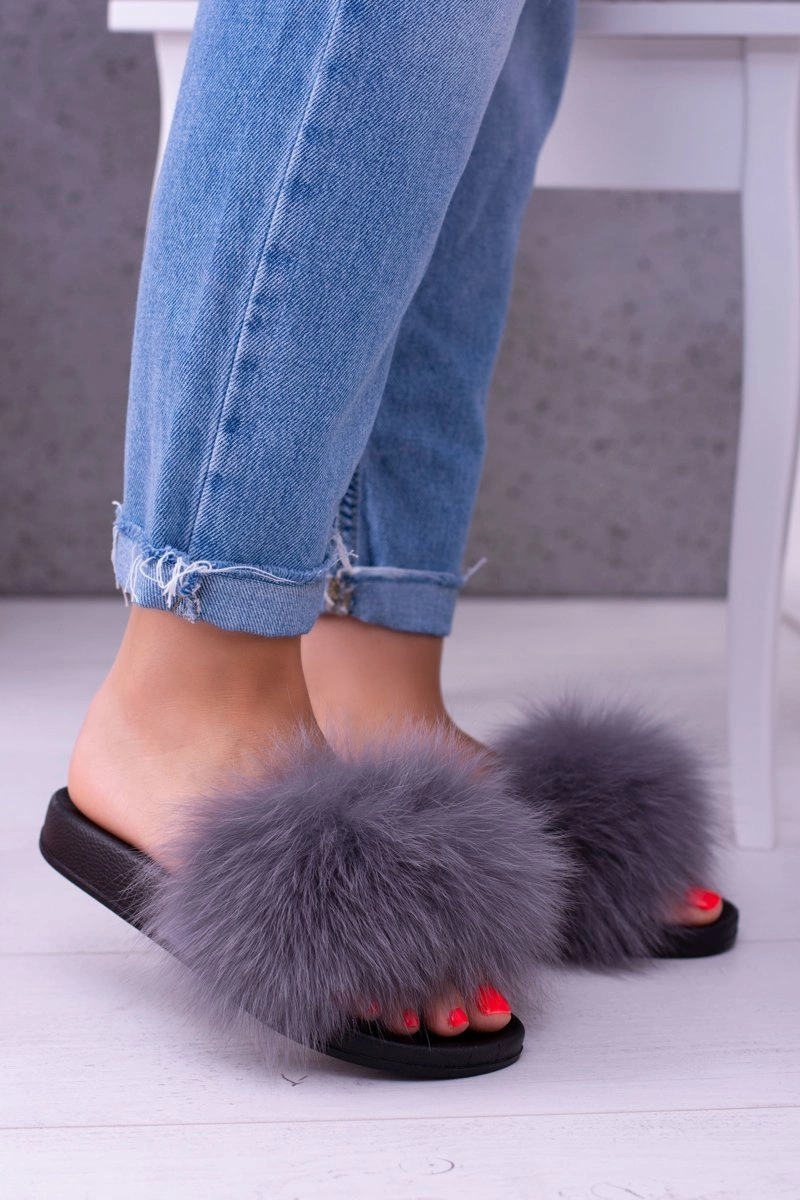 Damskie Klapki z Naturalnym Futerkiem Szare Naturis