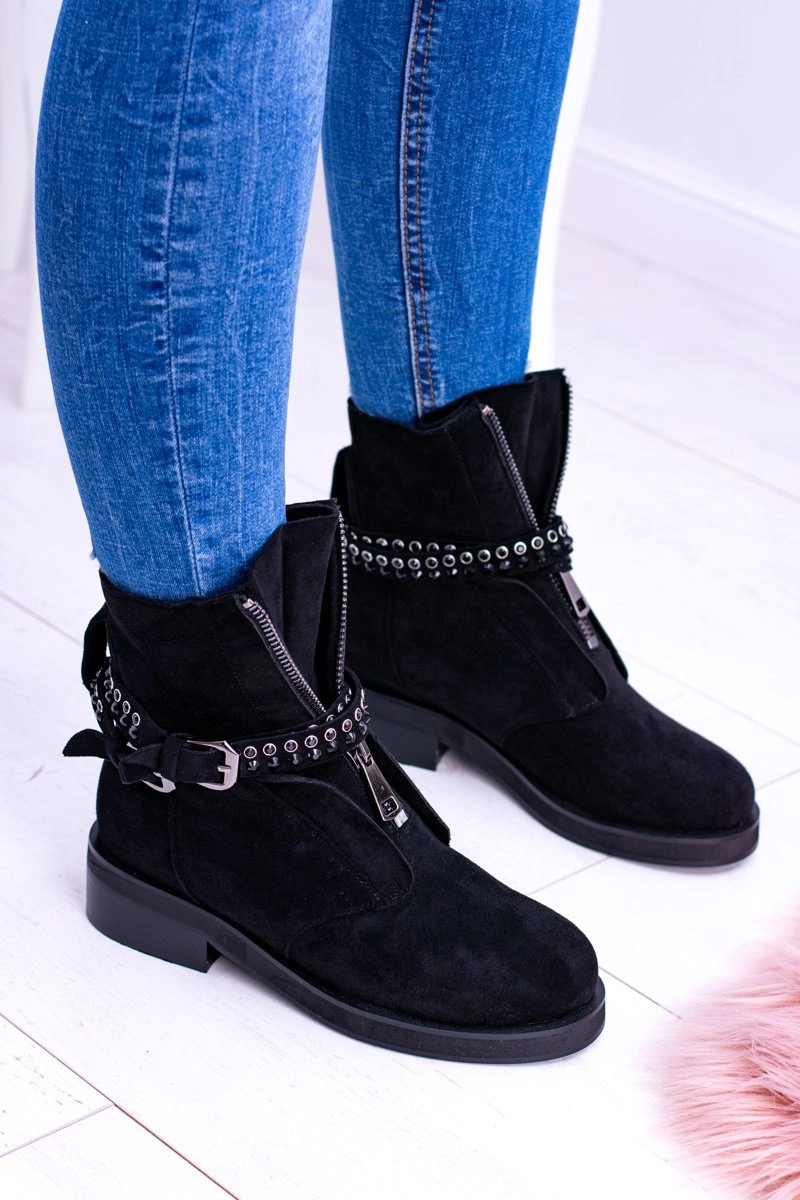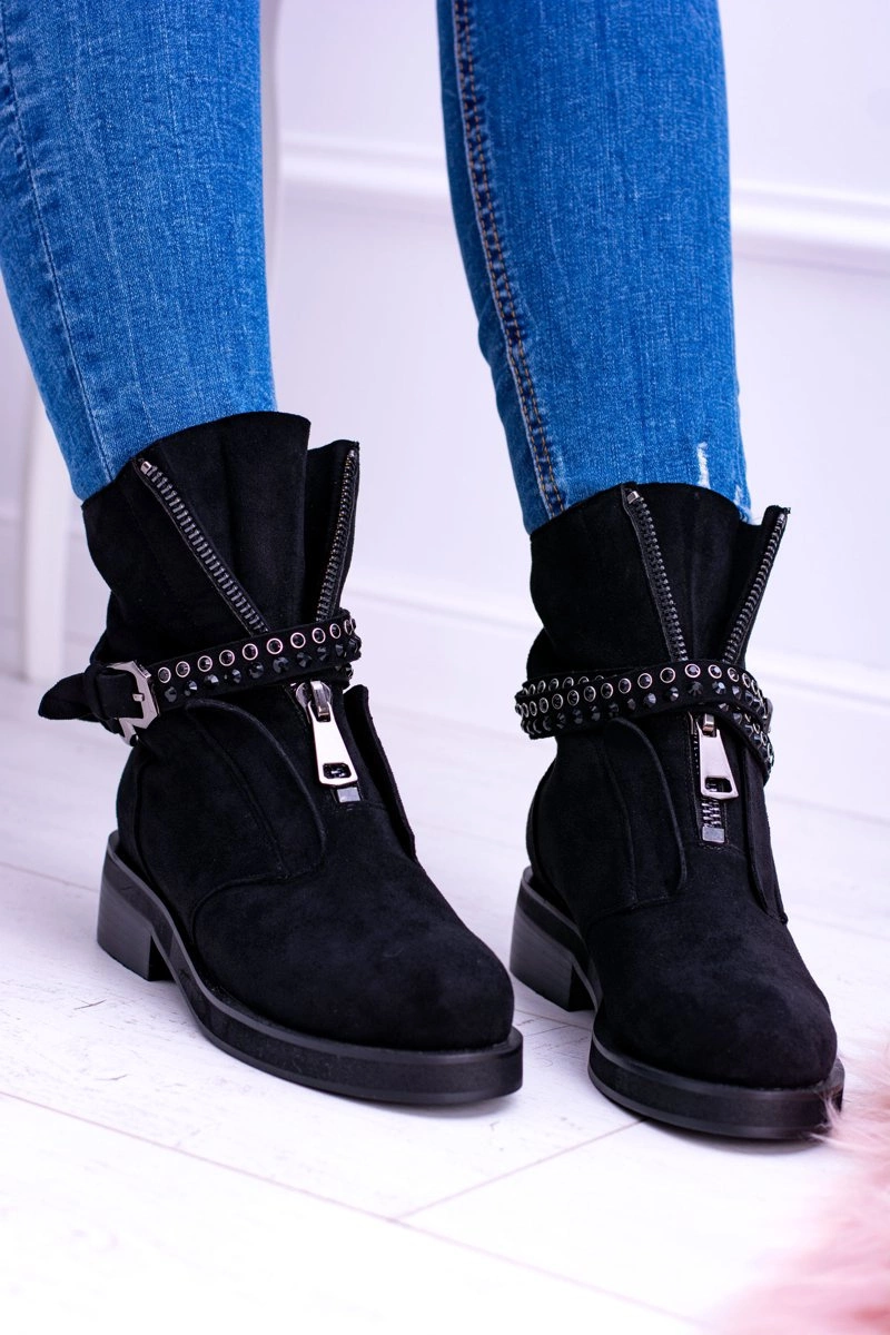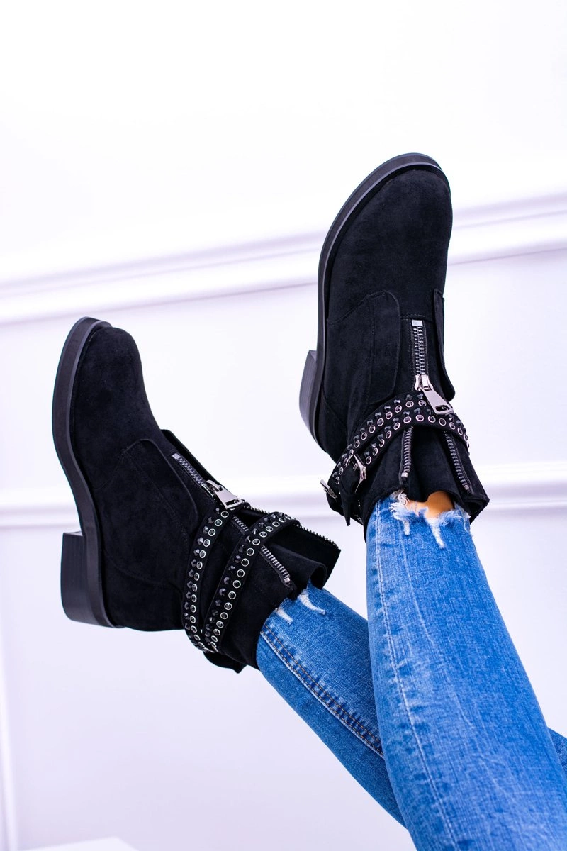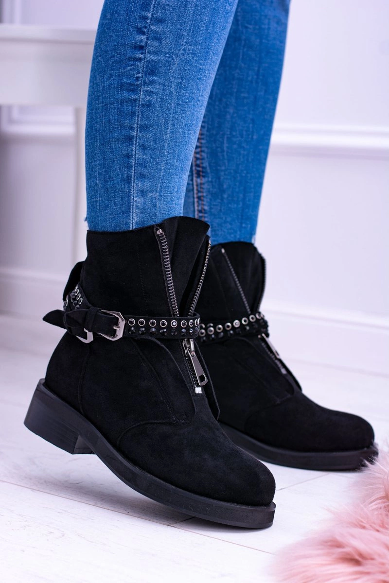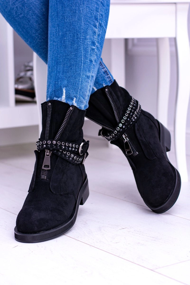 Stylowe, czarne botki nigdy nie wychodzą z mody. Nasza propozycja wspaniale uzupełni wasze stylizacje. Botki są niezwykle wygodne, a dzięki zamkowi idealnie dopasujesz je do stopy. Modne zdobienia w postaci pasków, klamry oraz mieniących się cekinów. Dodatkowym zdobieniem jest suwak na cholewce, który pięknie podkreśla ich wyjątkowości.