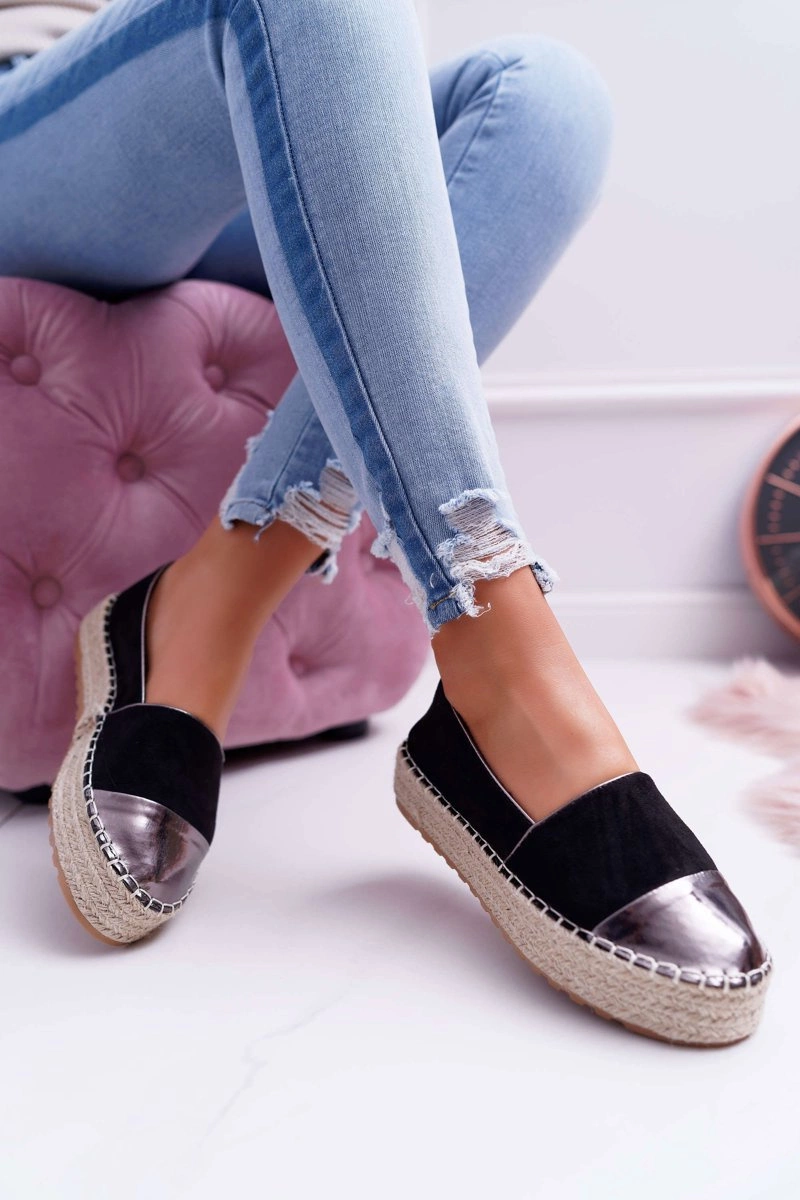 Damskie stylowe espadryle. Wykonane z ekozamszu, posiadają zdobiony nosek. Wysoka platforma sprawia, że przyjmujemy stabilną pozycję. Przy wyborze rozmiaru prosimy sugerować się tabelą rozmiarów.