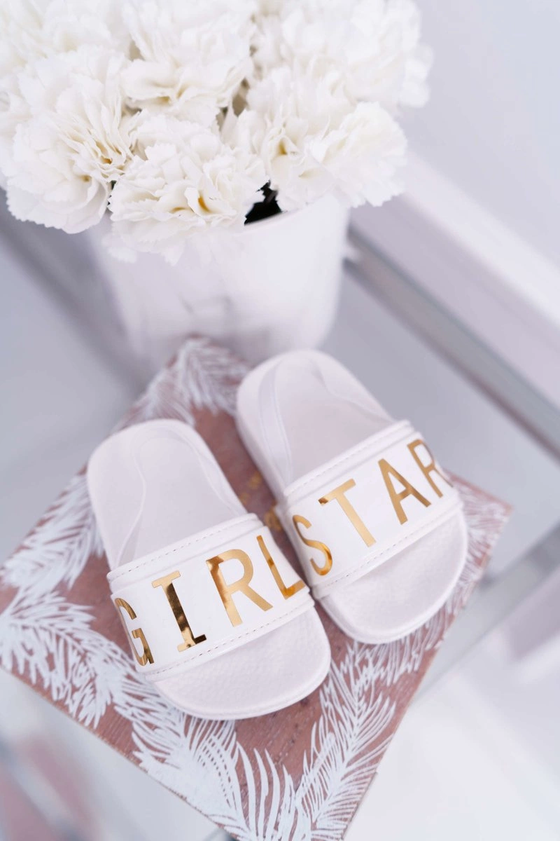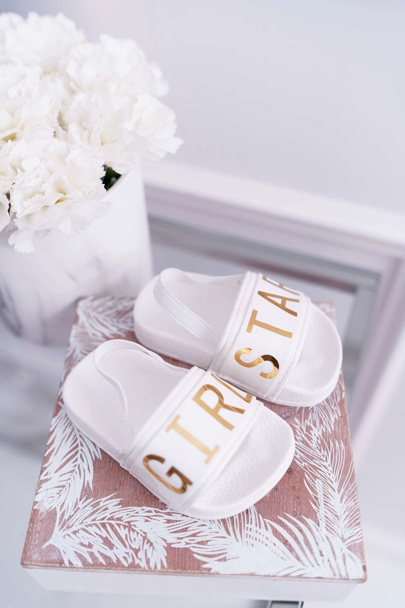 Dziecięce Klapki Dziewczęce Złoty Napis Girl Star Białe Bambi