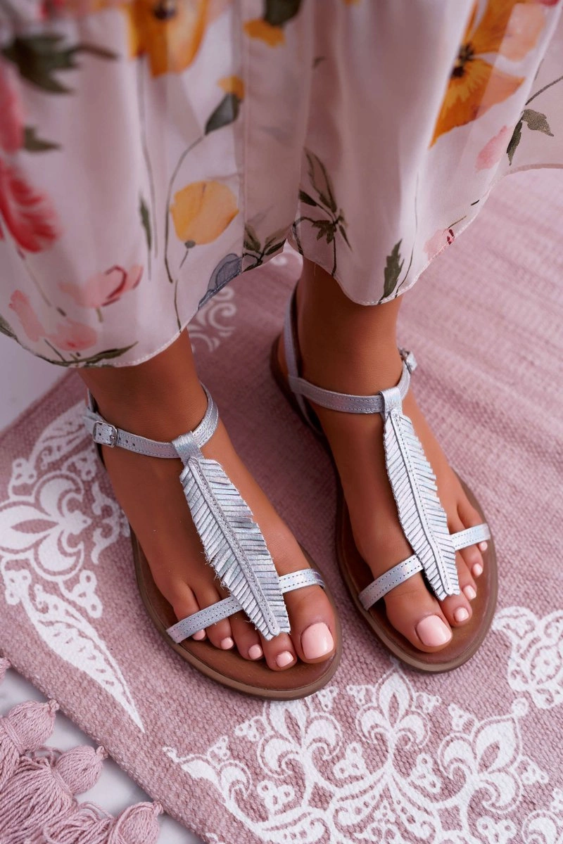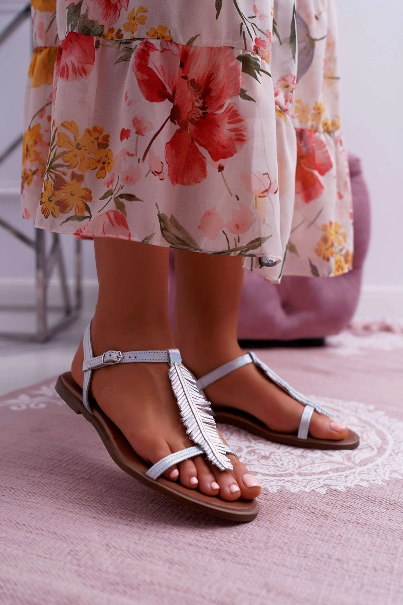 Sandały Damskie Płaskie Skórzane Srebrne Nicole 2383