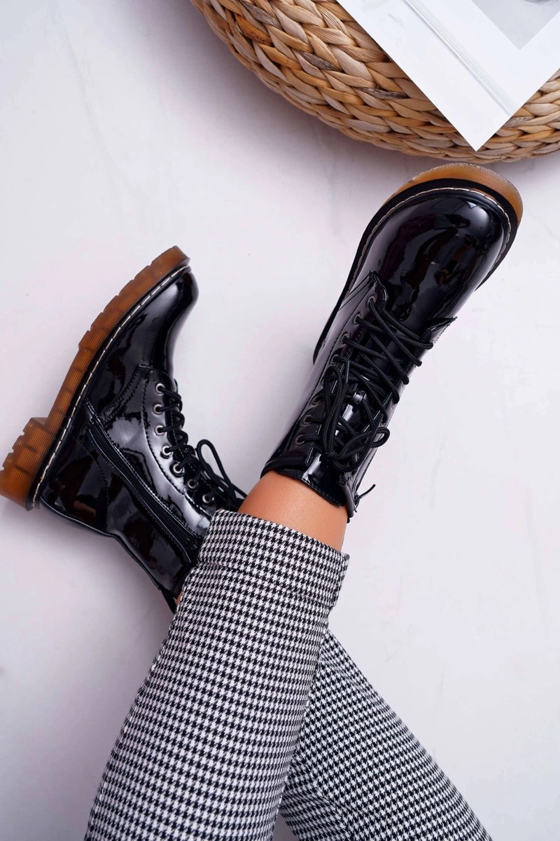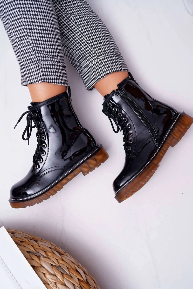 Botki Damskie Płaski Obcas Wysokie Glany Lakierowane Czarne Martenis