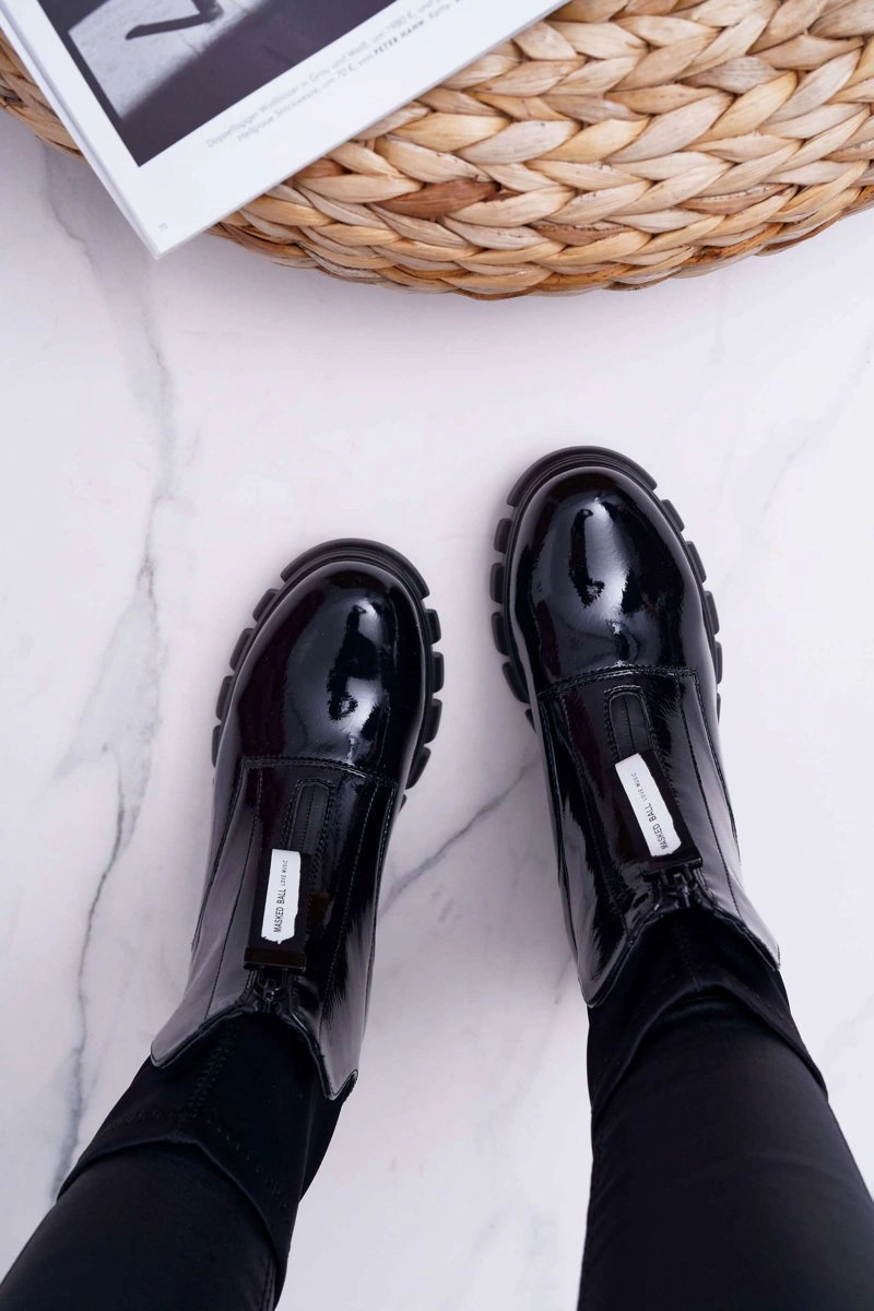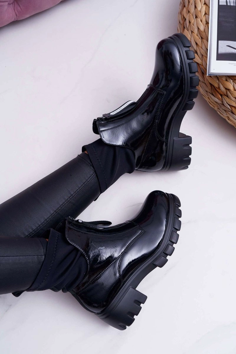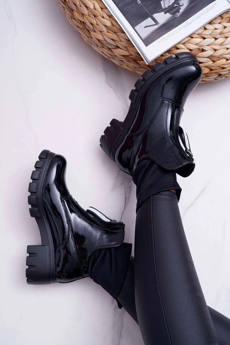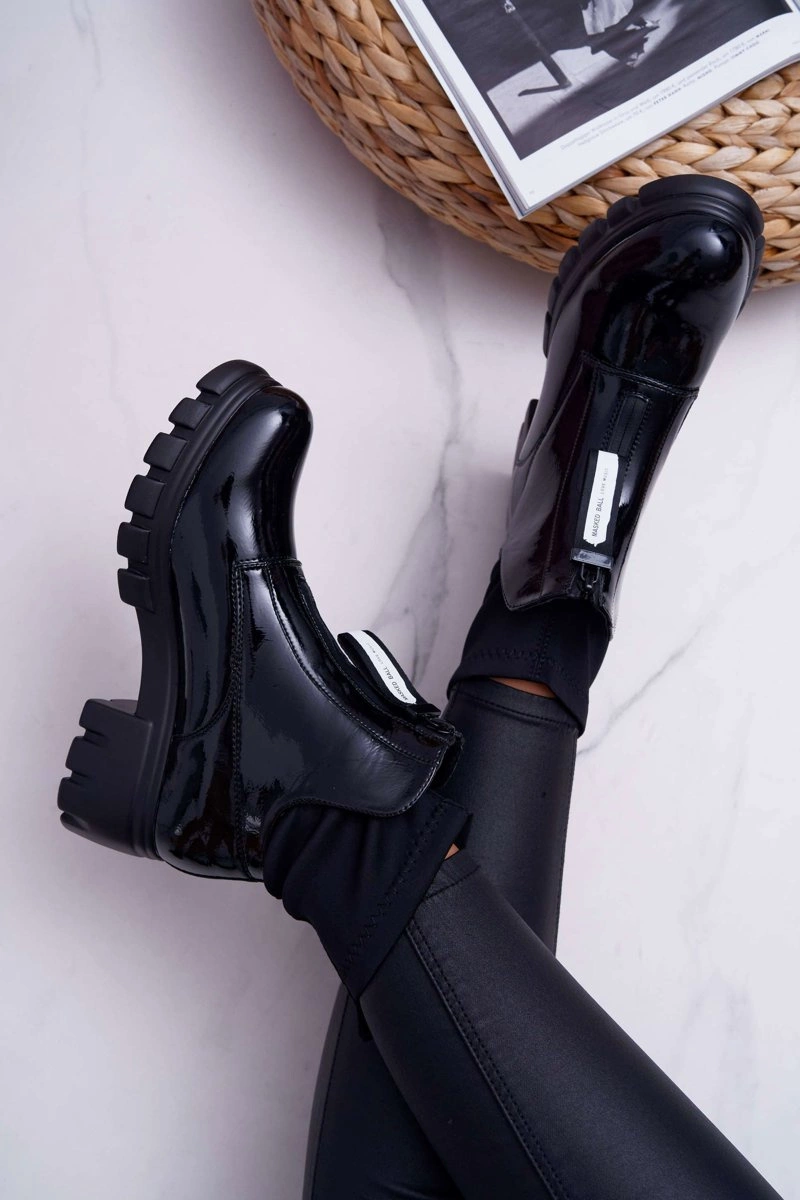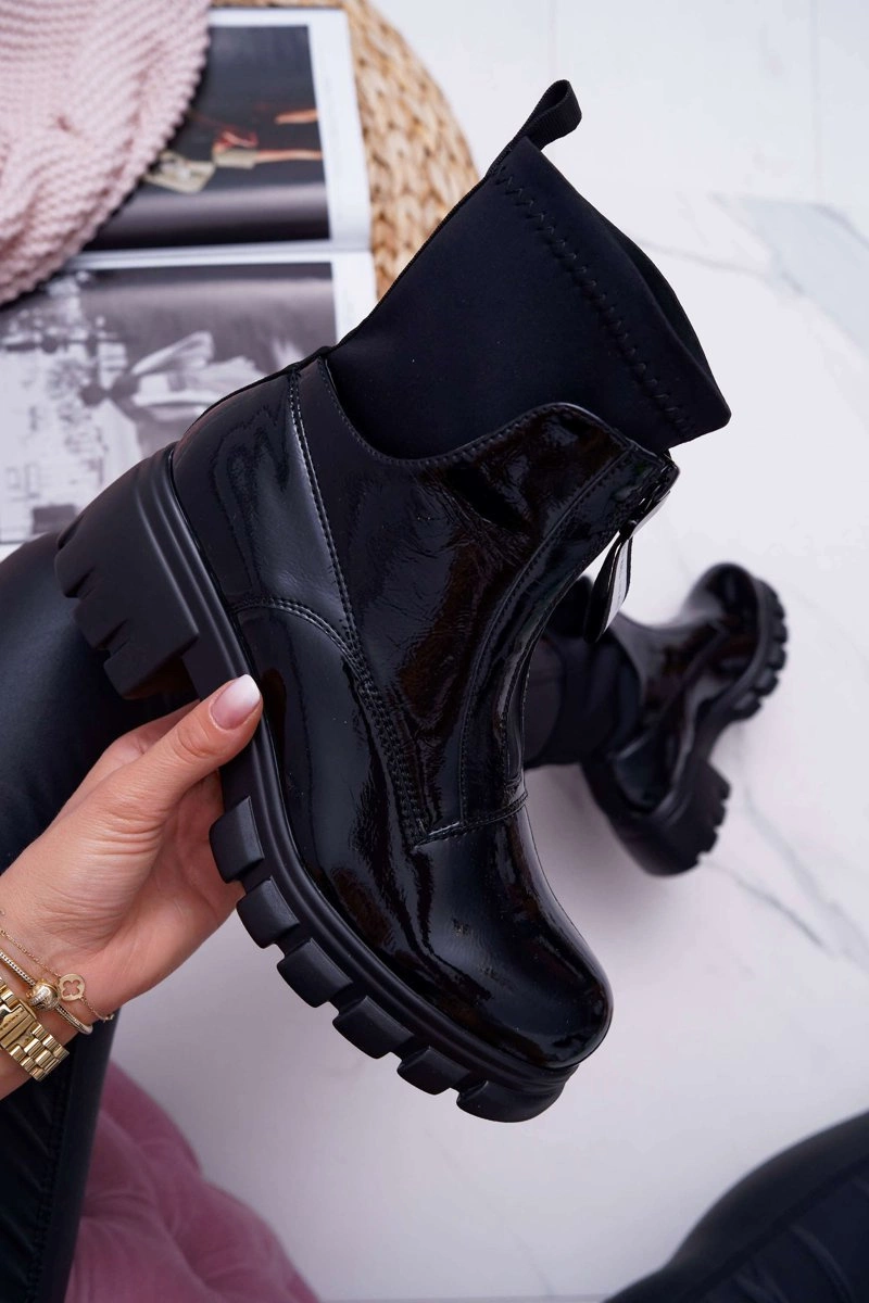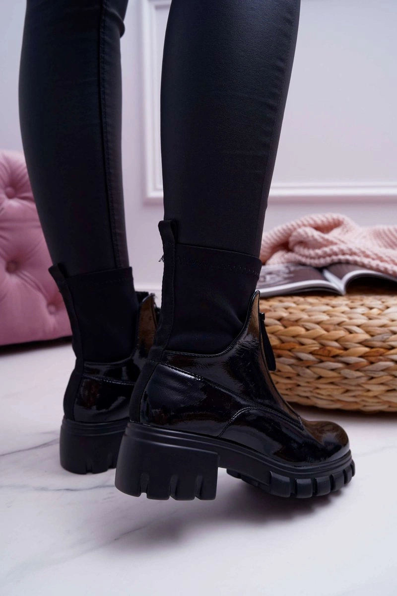 Botki Emelia wykonane z czarnej lakierowanej eko-skóry. Nowoczesny wzór w stylu glamour. Wsuwane botki zakończone elastyczną "skarpetą". Zdobienie w postaci suwaka z napisem podkreśla ich wyjątkowość. Przy wyborze rozmiaru prosimy sugerować się tabelą rozmiarów, która dostępna jest po najechaniu bądź kliknięciu w dany rozmiar.