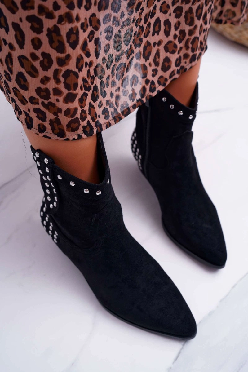 Przepiękne botki z noskiem w szpic w ciekawej odsłonie ze srebrnymi nitami. Klasyczny kolor w pięknej wersji z eko-zamszu. Te botki pasują dosłownie do wszystkiego. Kowbojki na płaskim obcasie to gwarancja komfortu i wyszukanego stylu. Zapinanie na suwak ułatwi zakładanie. Przy wyborze rozmiaru prosimy sugerować się tabelą rozmiarów, która dostępna jest po najechaniu bądź kliknięciu w dany rozmiar.