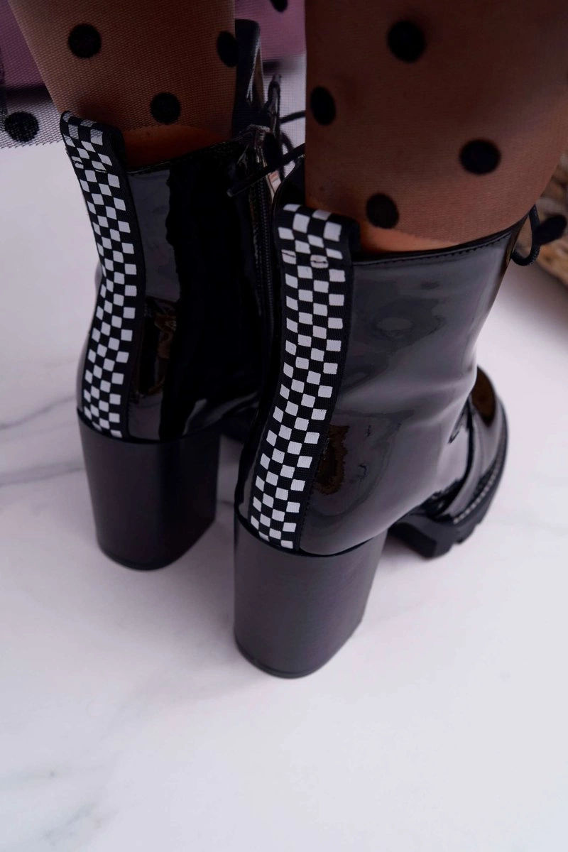 Lakierowane damskie botki. Cholewka zdobiona jest czarno białą kratką na zapiętku. Botki sznurowane oraz zapinane na dodatkowy suwak na boku. Ocieplane kocem obuwniczym. Przy wyborze rozmiaru prosimy sugerować się tabelą rozmiarów, która dostępna jest po najechaniu bądź kliknięciu w dany rozmiar.
