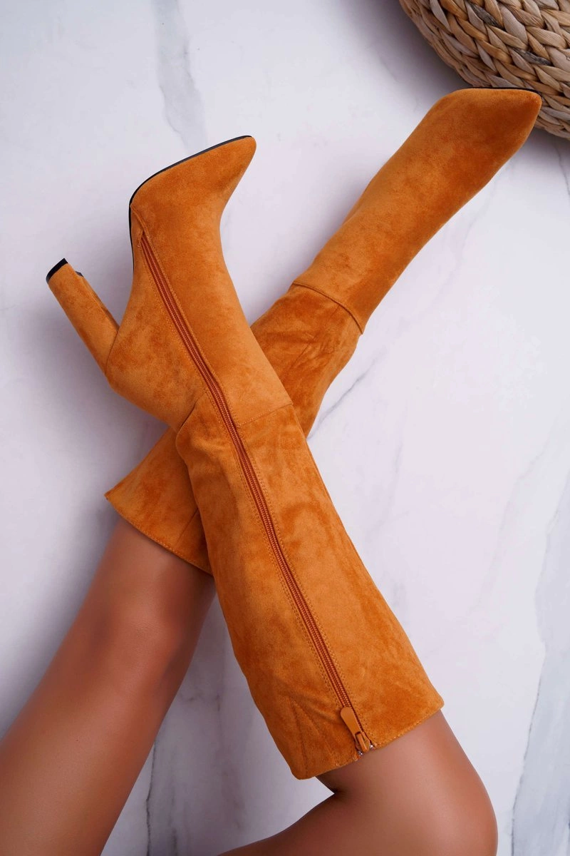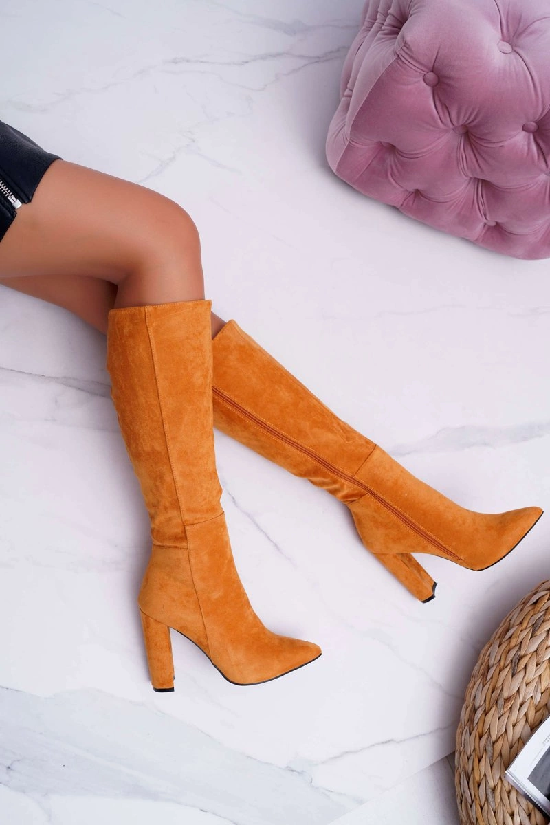 Modne botki na słupku, w całości wykonane z ekozamszu. Delikatny słupek uniesie i optycznie wysmukli sylwetkę. Wysokość do kolana. Przy wyborze rozmiaru prosimy sugerować się tabelą rozmiarów.