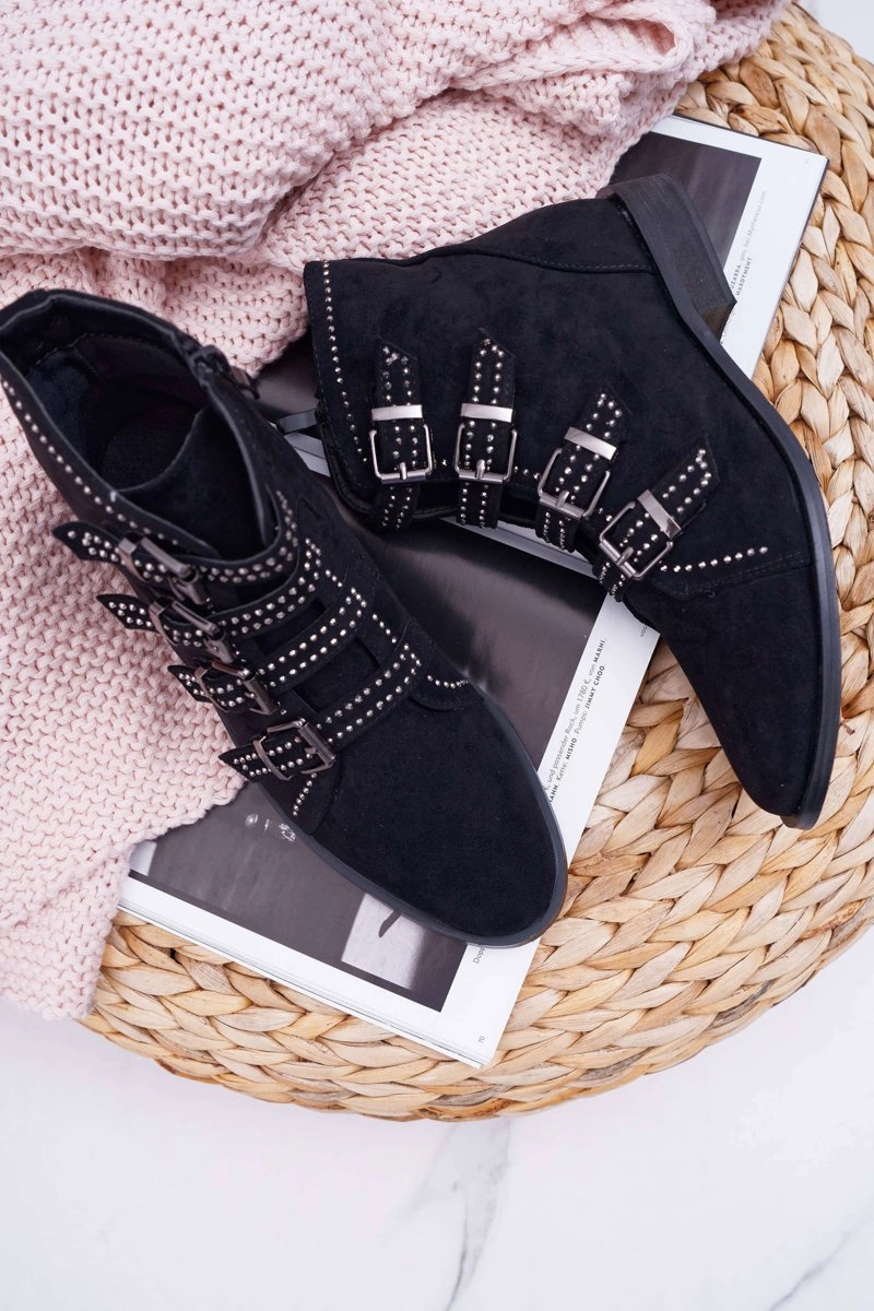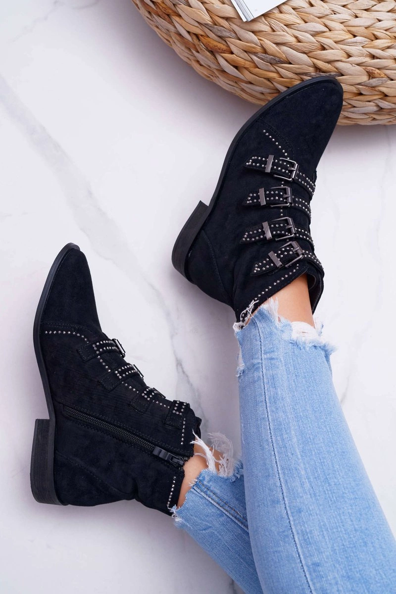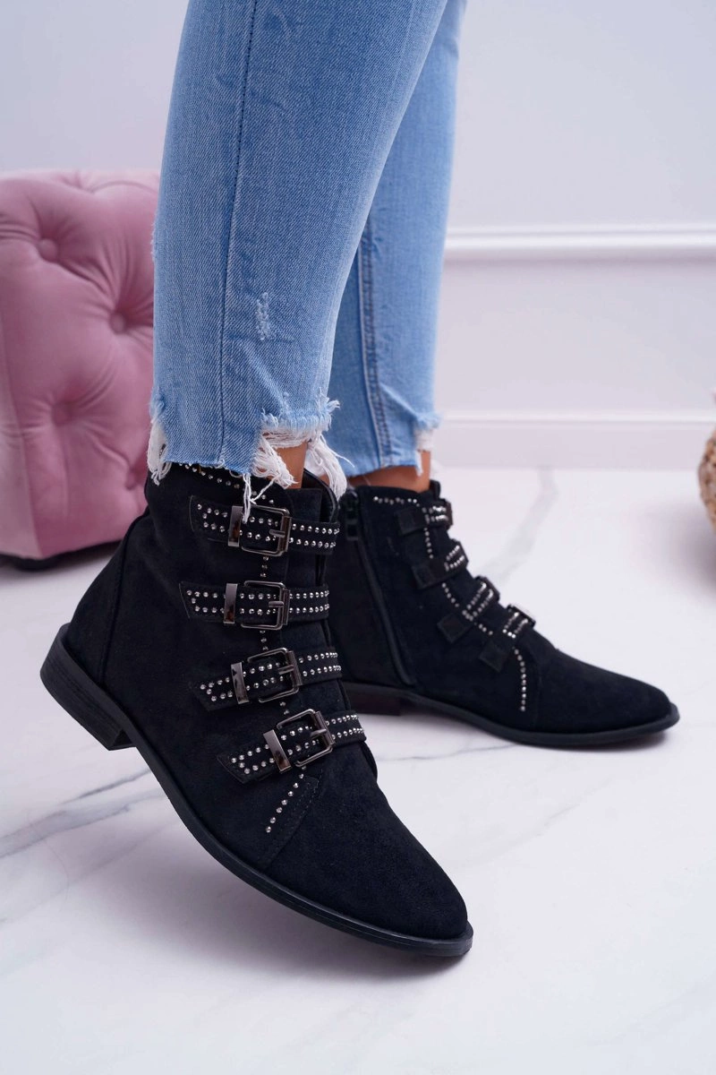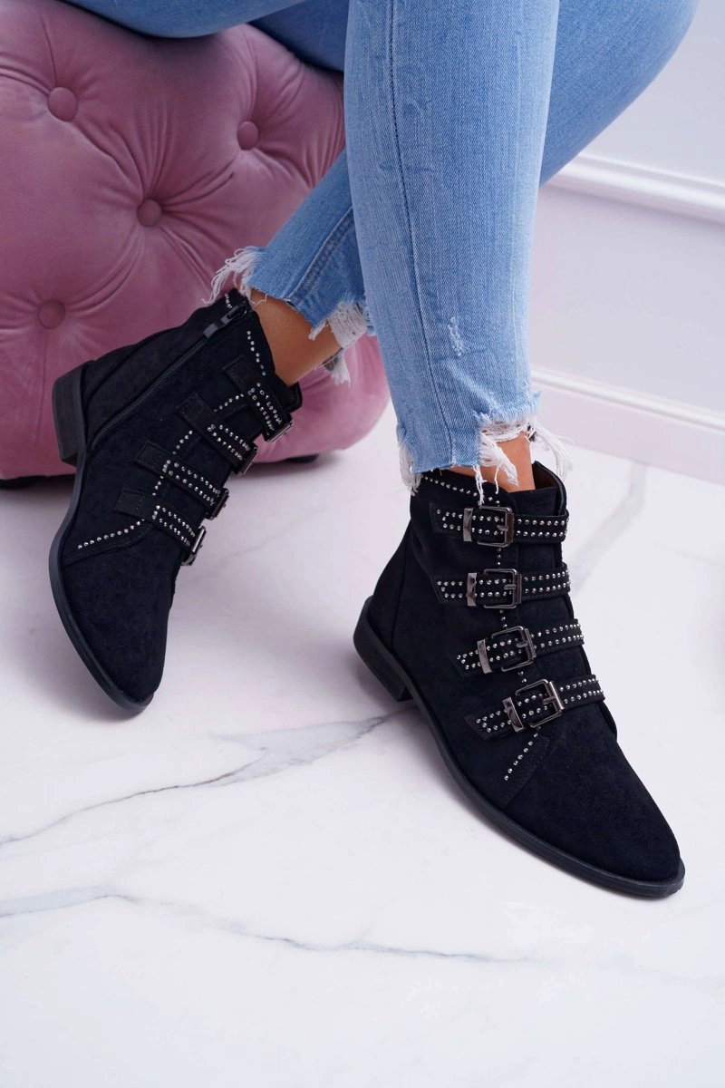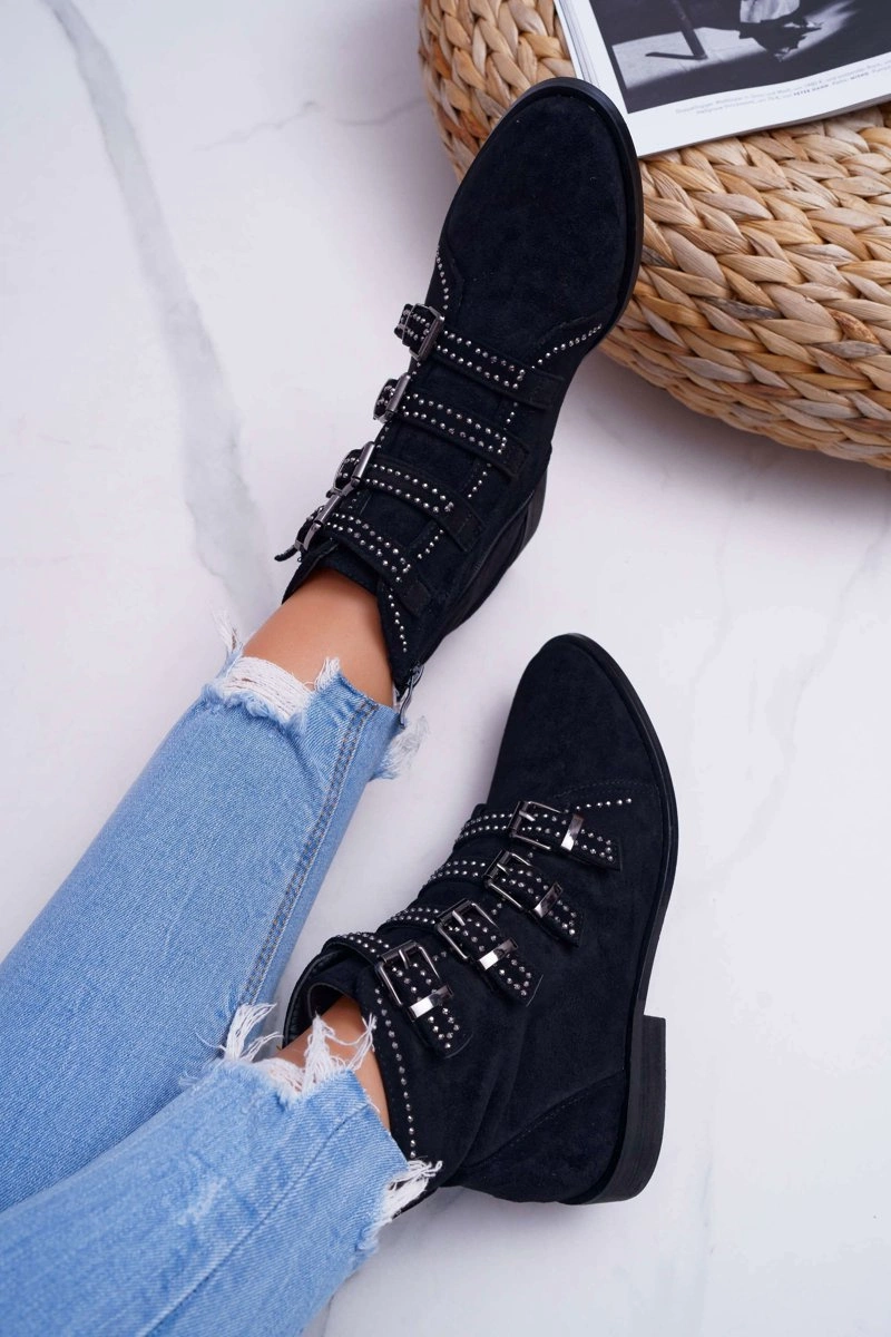 Damskie Botki Zamszowe Nity Klamry Czarne Berugio