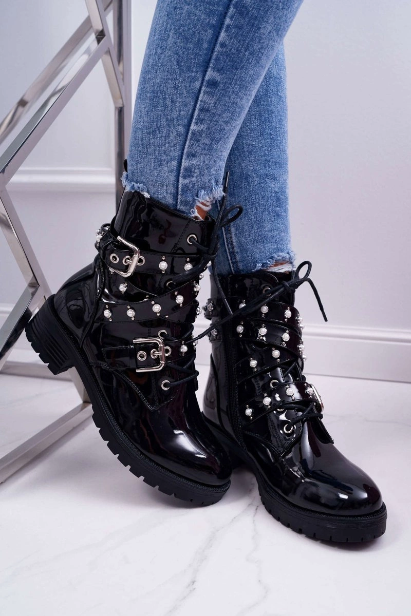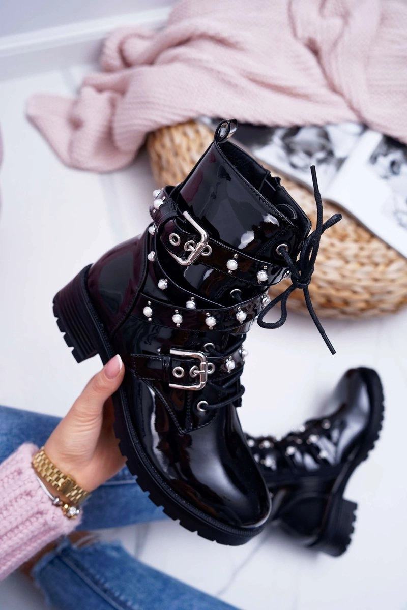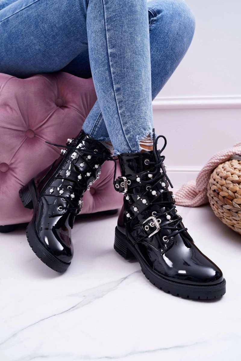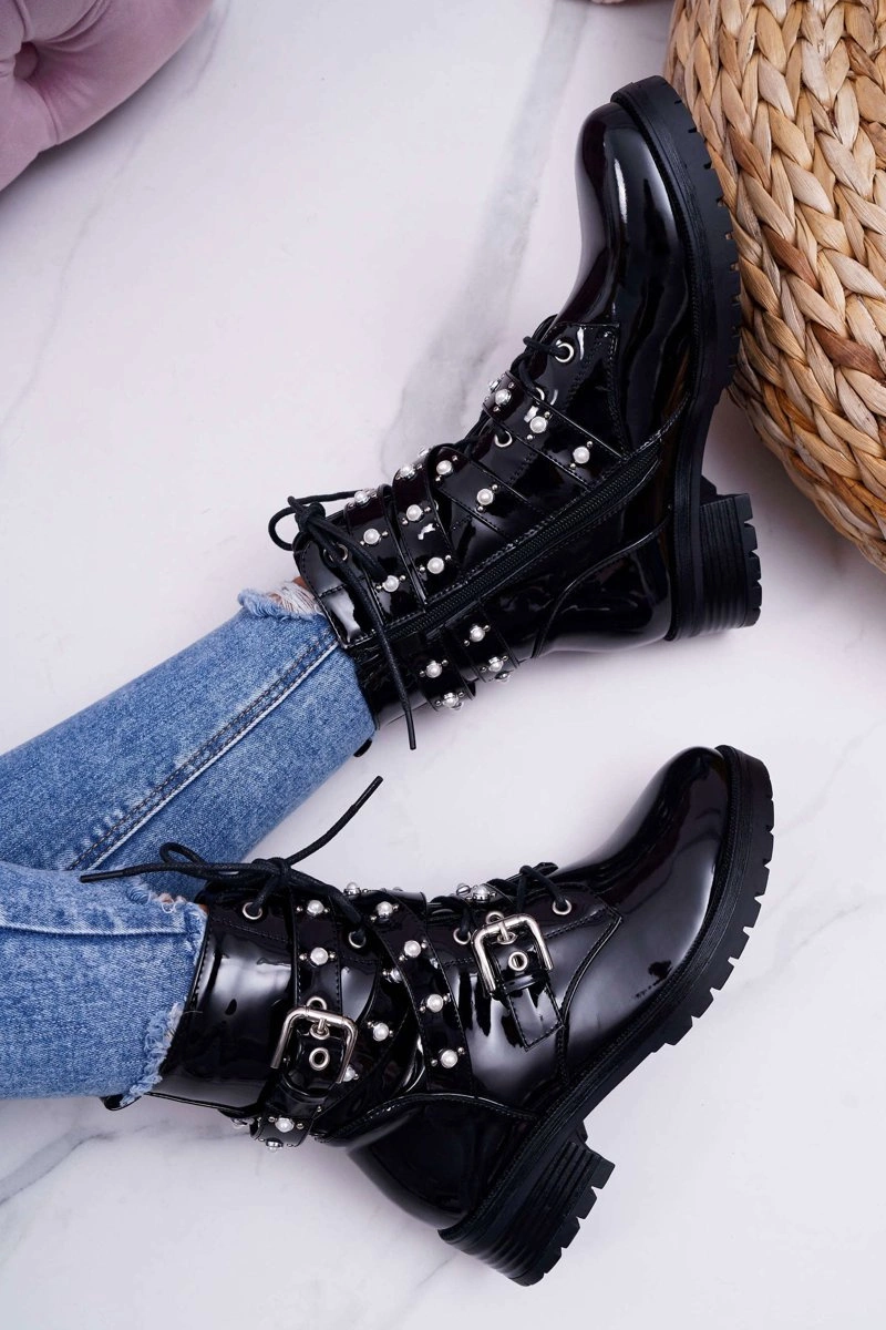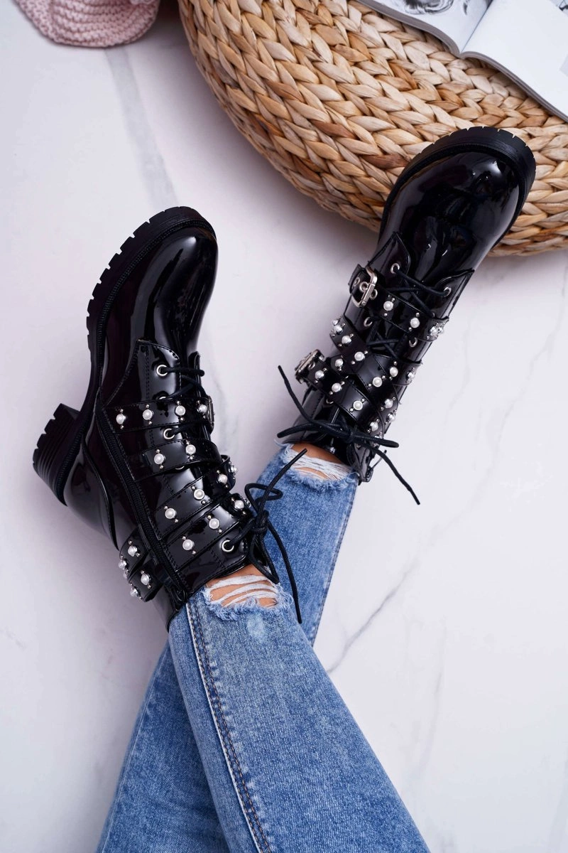 Botki Damskie Płaskie Lakierowane Z Perełkami Czarne Domination