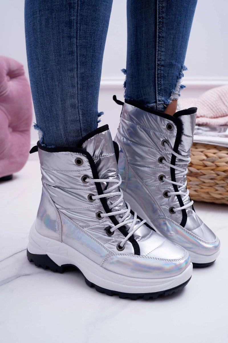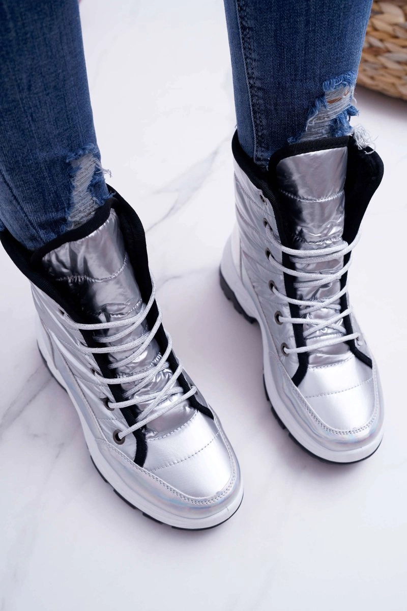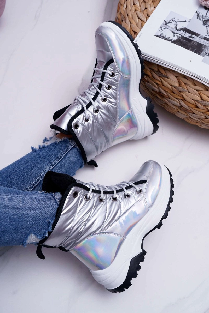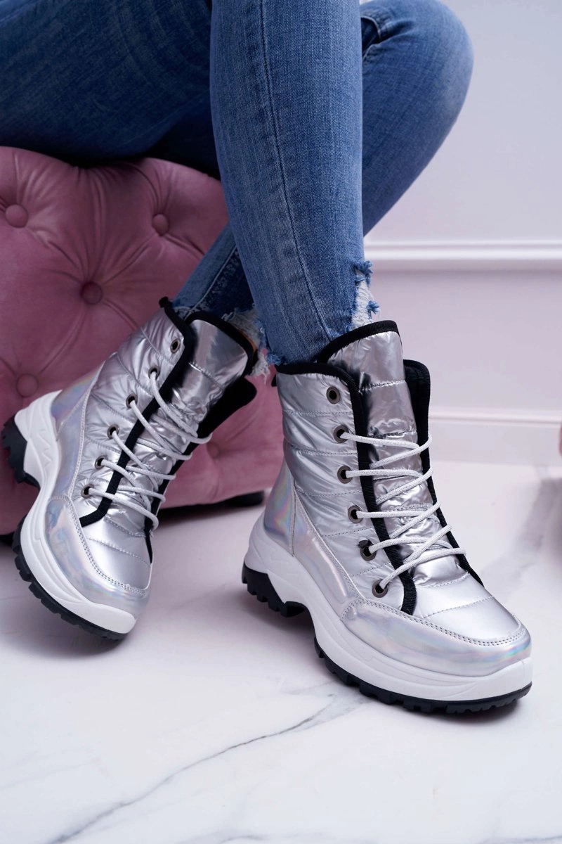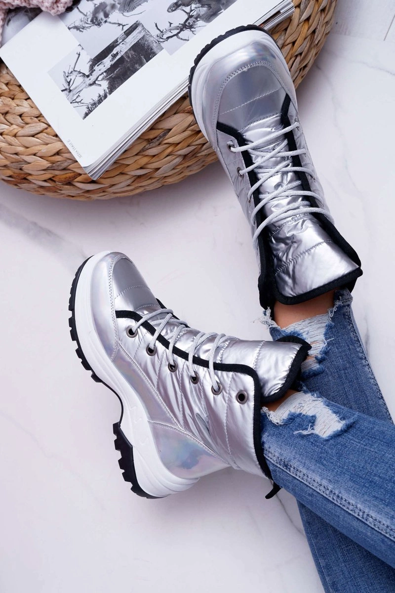Damskie Botki Śniegowce Ocieplane Futerkiem Srebrne Muffin