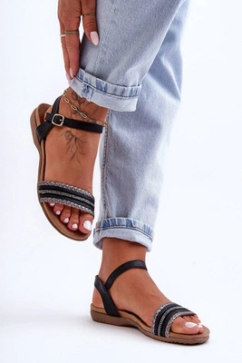 Sandały Damskie Z Ozdobnym Paskiem Płaskie Czarne Adissa