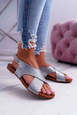 Sandały Damskie Płaskie Skórzane Srebrne Nicole 2383
