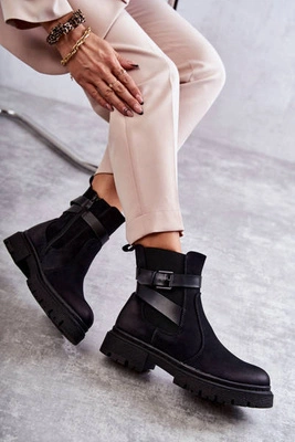 Damskie Ocieplane Botki Sztyblety Z Paskiem Czarne Jose