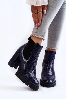 Lakierowane Botki Wężowy Wzór Na Słupku Granatowe Eldey