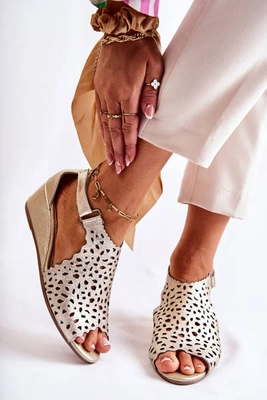 Skórzane Ażurowe Sandały Na Koturnie Złote Sellena